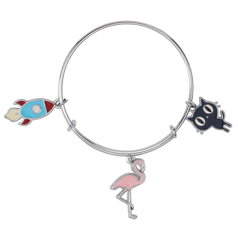 Add a touch of whimsy to your outfit with this charming bracelet featuring enamel work charms in swan, cat, and rocket shapes. Rhodium plated for a lasting shine.