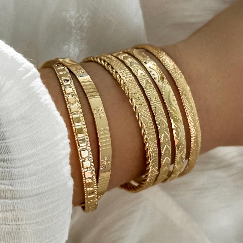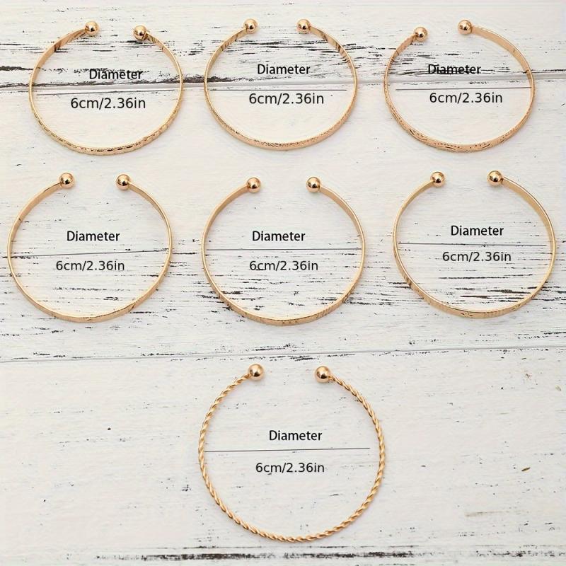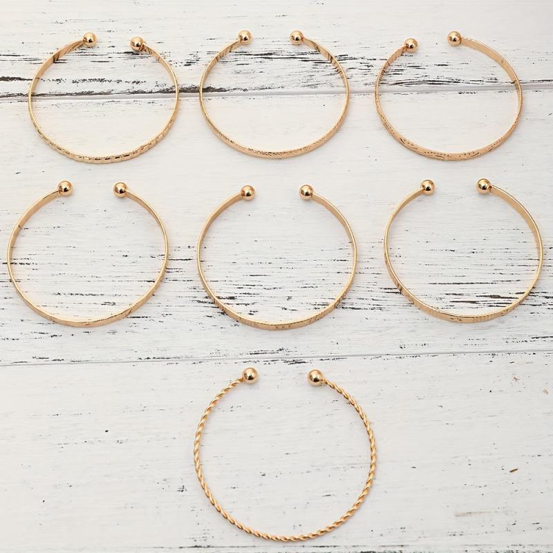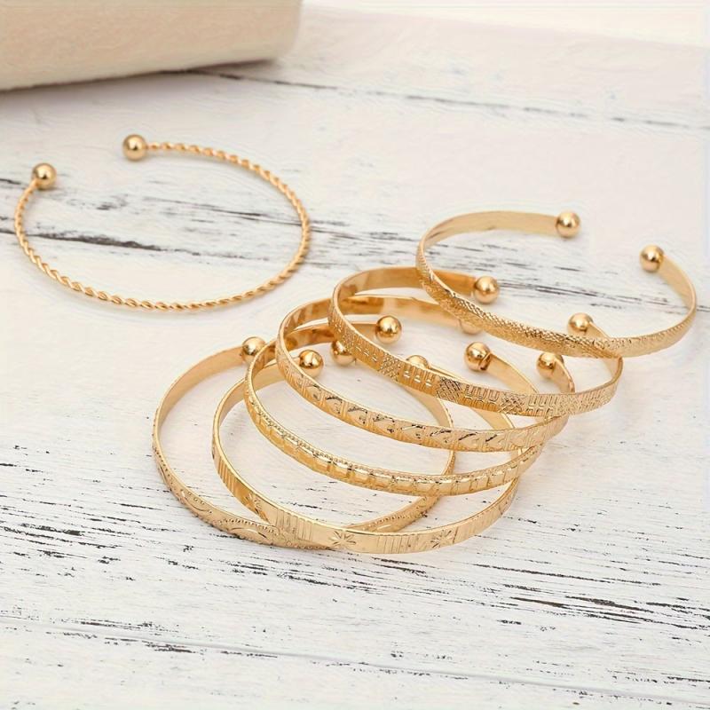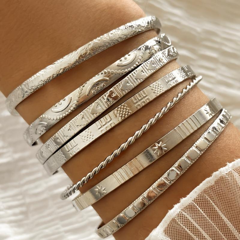 This bracelet set features a vintage ethnic style with carved patterns and open iron rings. Set includes 7 pieces to mix and match for a unique look.