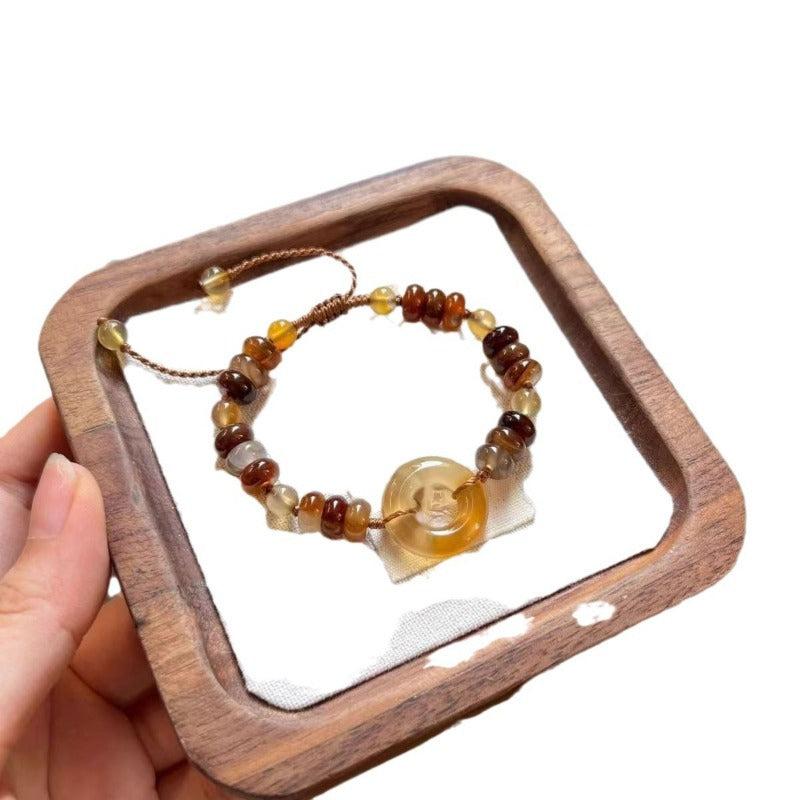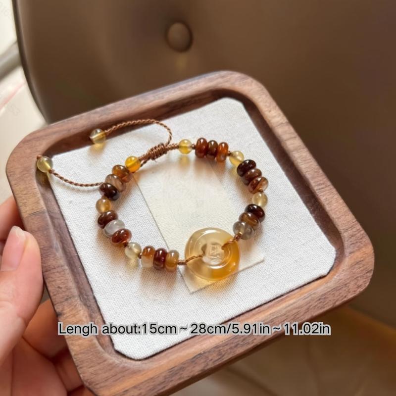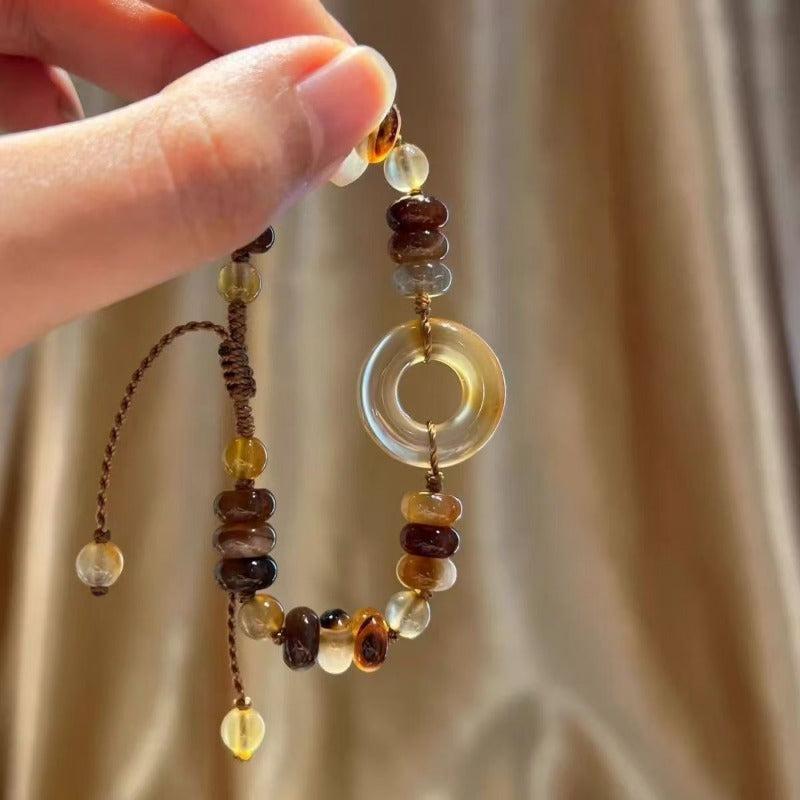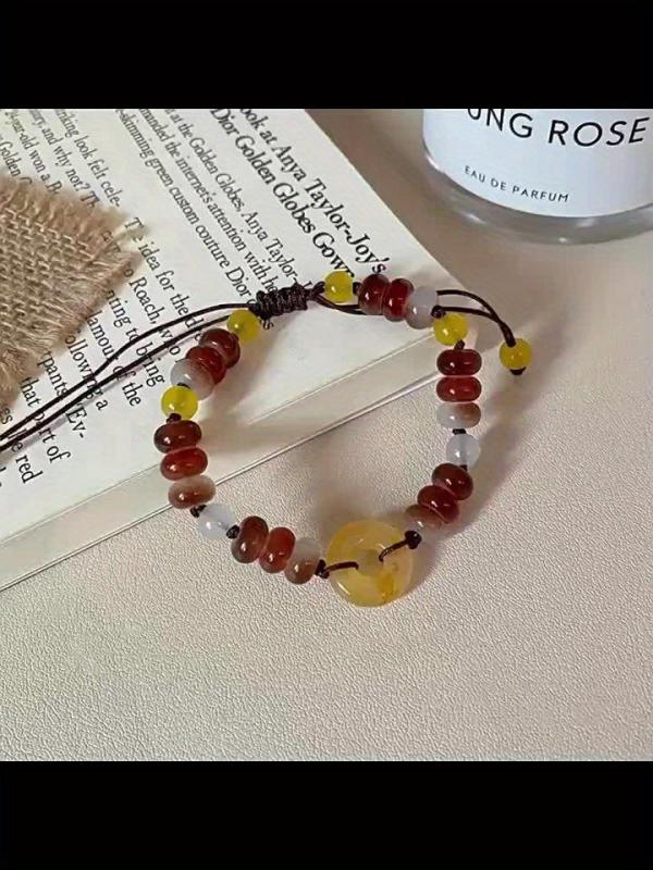 Add a touch of retro style to your outfit with this ethnic woven bracelet featuring amber-toned artificial crystal beads. Perfect as a gift for girlfriends or to complement casual attire.