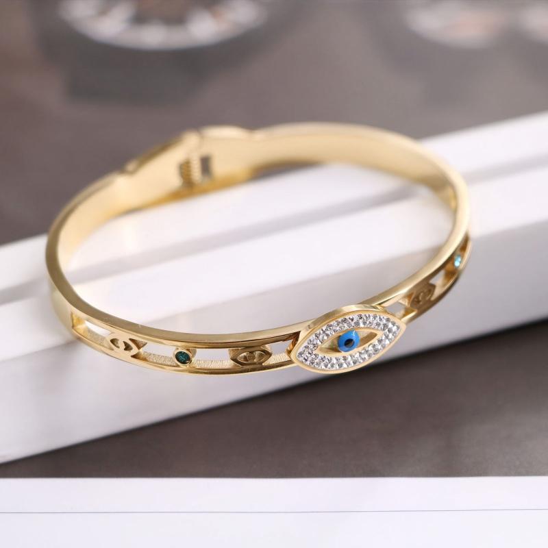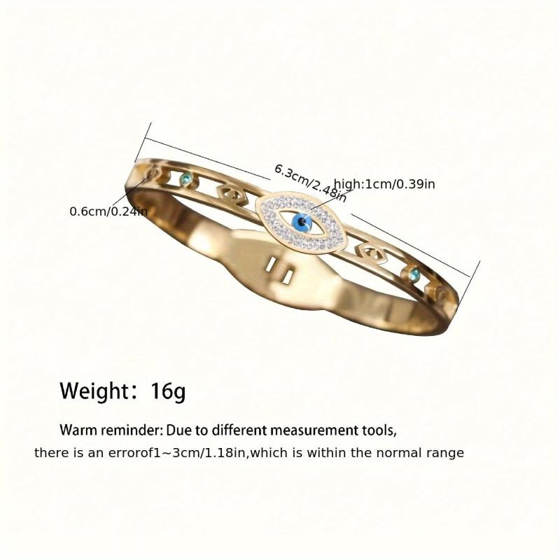 This bracelet features a stunning Evil Eye design with rhinestone accents, made from stainless steel with 18K golden plating. It exudes a vintage style that adds elegance to any outfit.