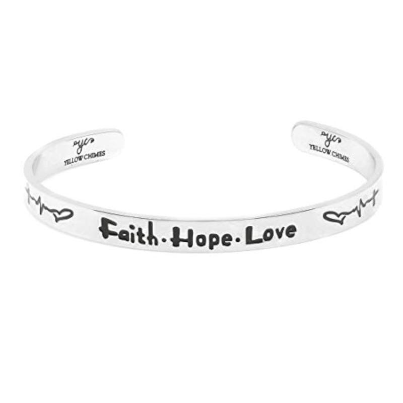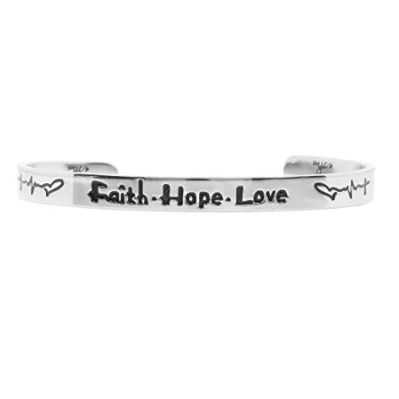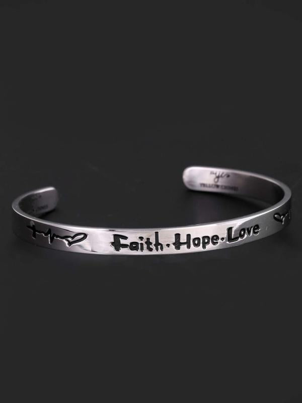 This inspirational bracelet features engraved messages of Faith, Hope, and Love. Made of mirror polished stainless steel, this Karma Band Kada is a stylish accessory.