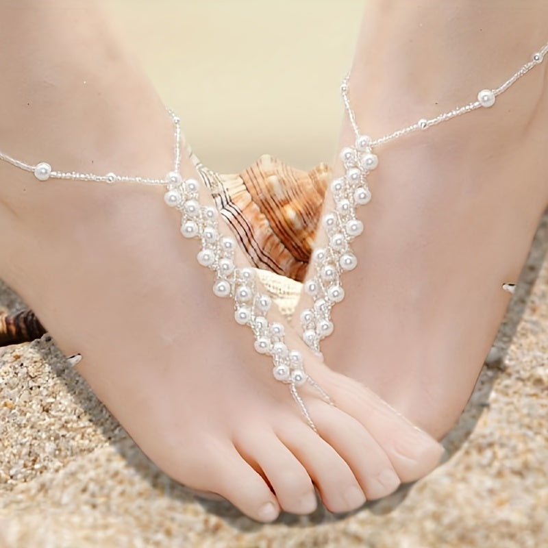 Add a touch of elegance to your look with this unique ankle bracelet featuring faux pearls and beads. Perfect for a beach wedding or summer days.