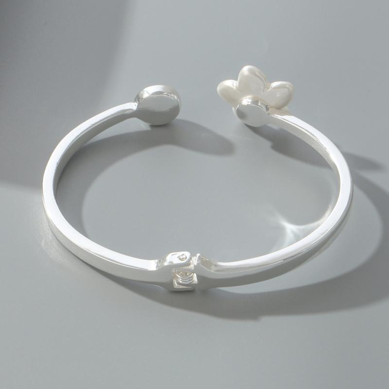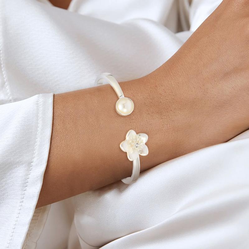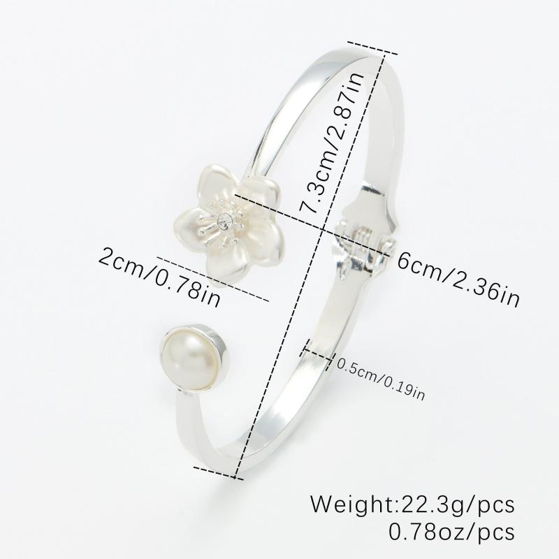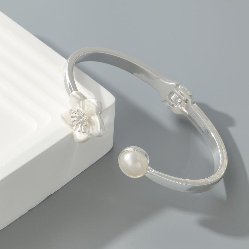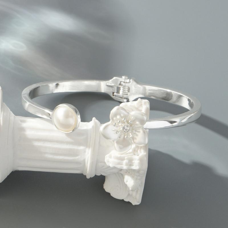 Elegant open cuff bracelet featuring faux pearls and floral design, perfect for casual attire and gifting. Hypoallergenic materials ensure comfortable wear.