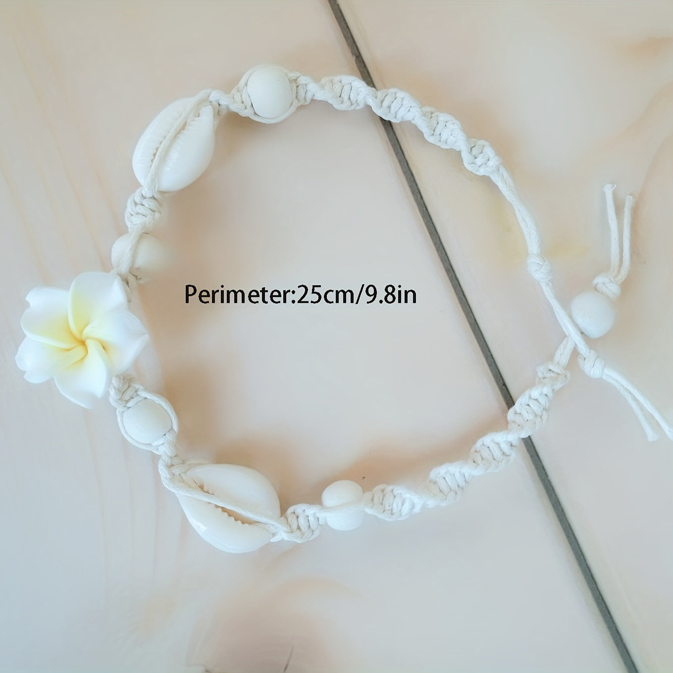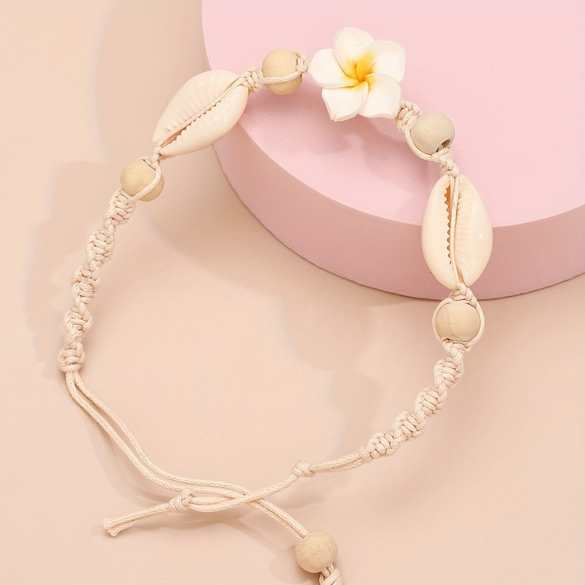 Adorn your ankle with this beautiful flower-shaped braided bracelet featuring shell shape beads. This adjustable anklet adds a touch of boho-chic to your style.