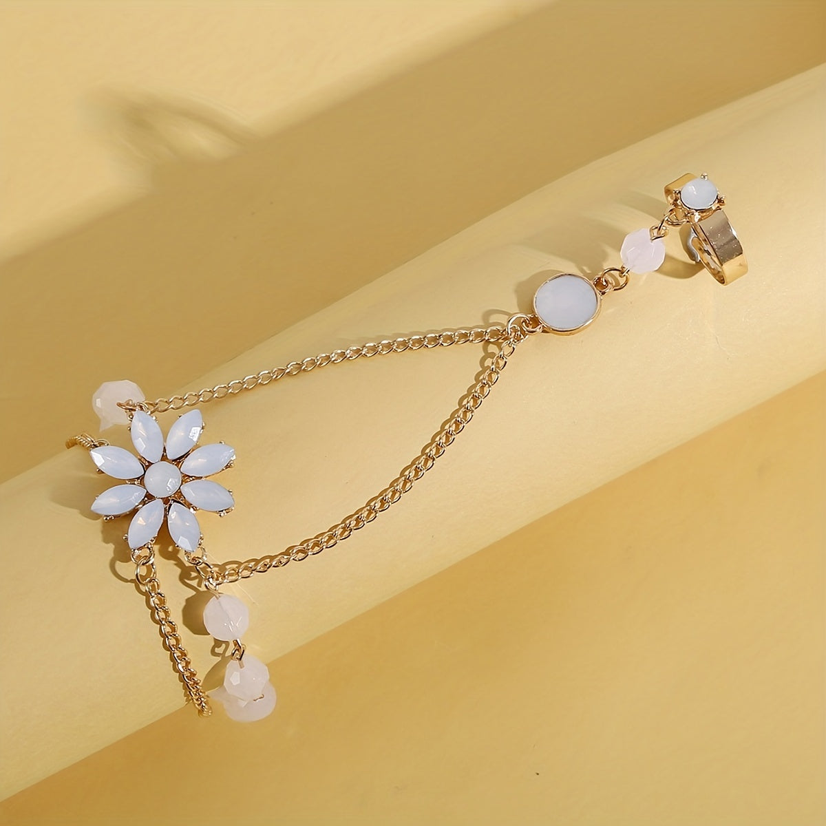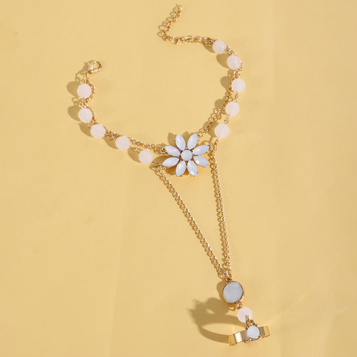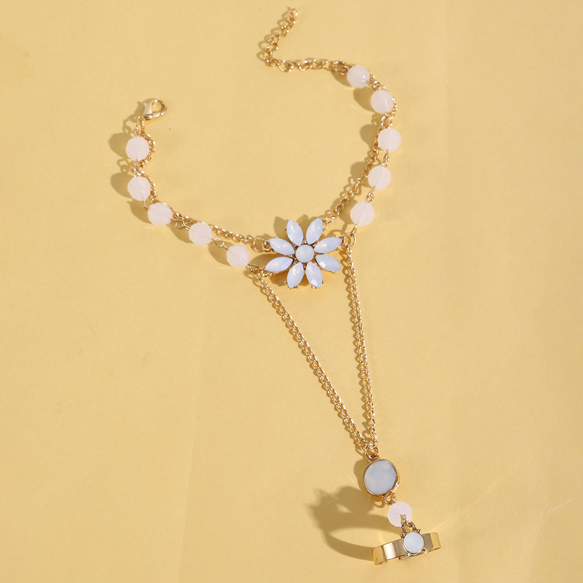 This Flower Finger Ring Bracelet is a stylish hand jewelry accessory that adds a touch of summer beach vibes to your outfit. The adjustable design ensures a comfortable fit, making it perfect for any occasion.