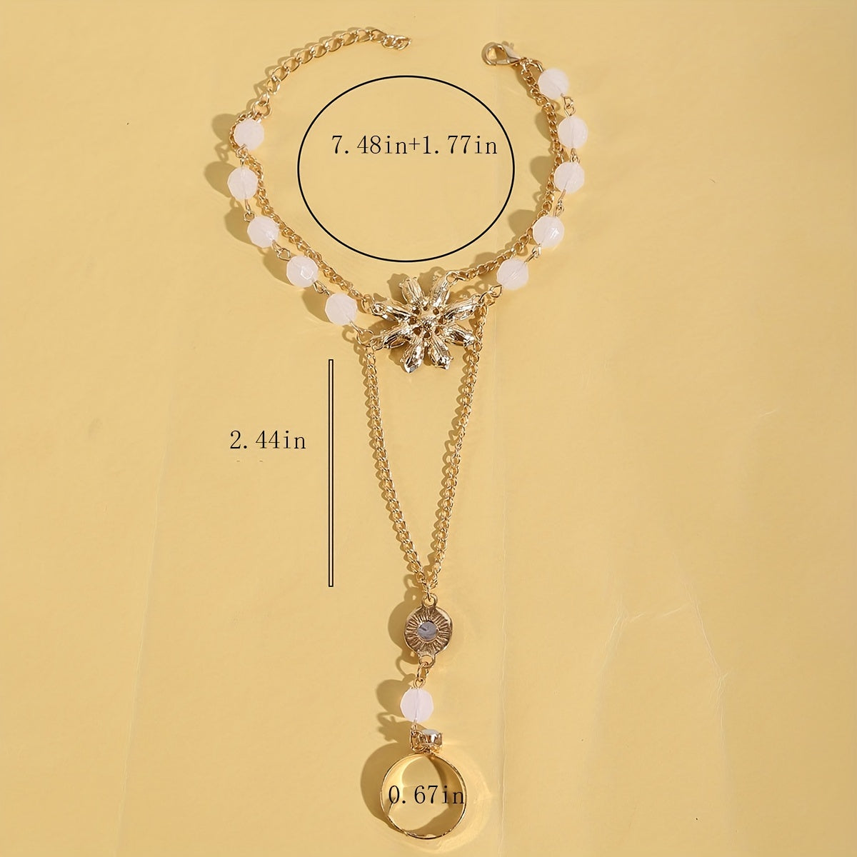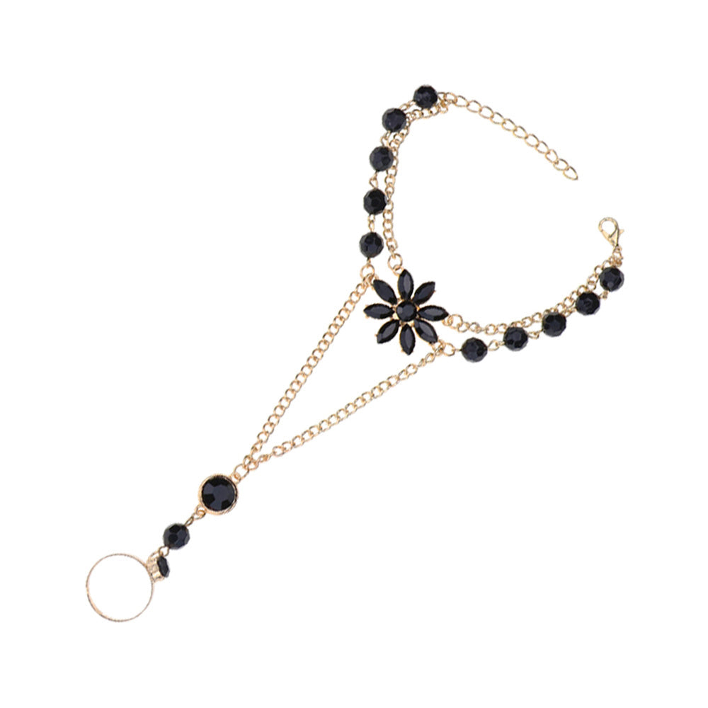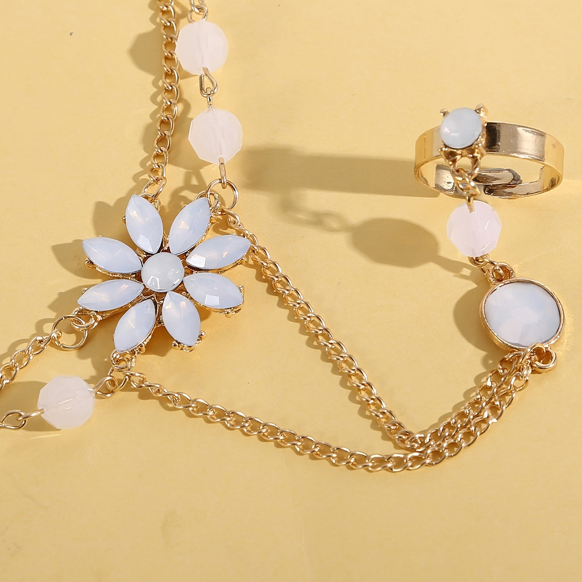 This Flower Finger Ring Bracelet is a stylish hand jewelry accessory that adds a touch of summer beach vibes to your outfit. The adjustable design ensures a comfortable fit, making it perfect for any occasion.