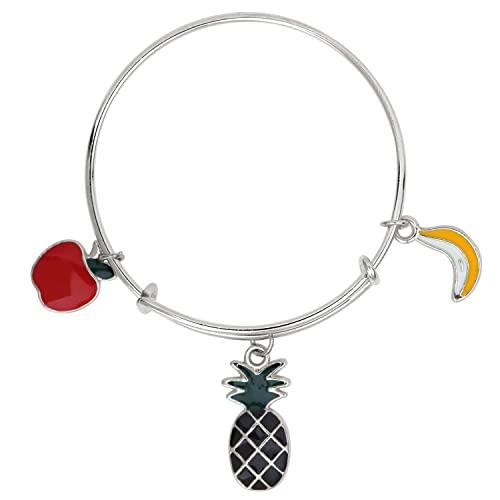 Adorn your wrist with this delightful fruit charm bracelet featuring apple, banana, and pineapple shapes with enamel work. Rhodium plated for a shiny finish.