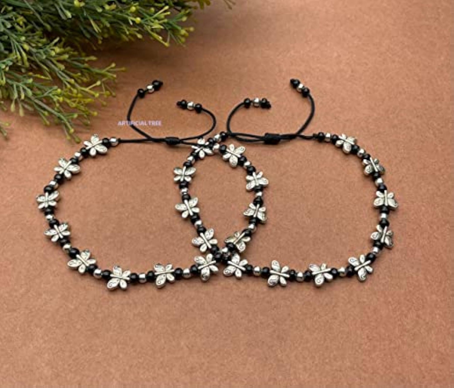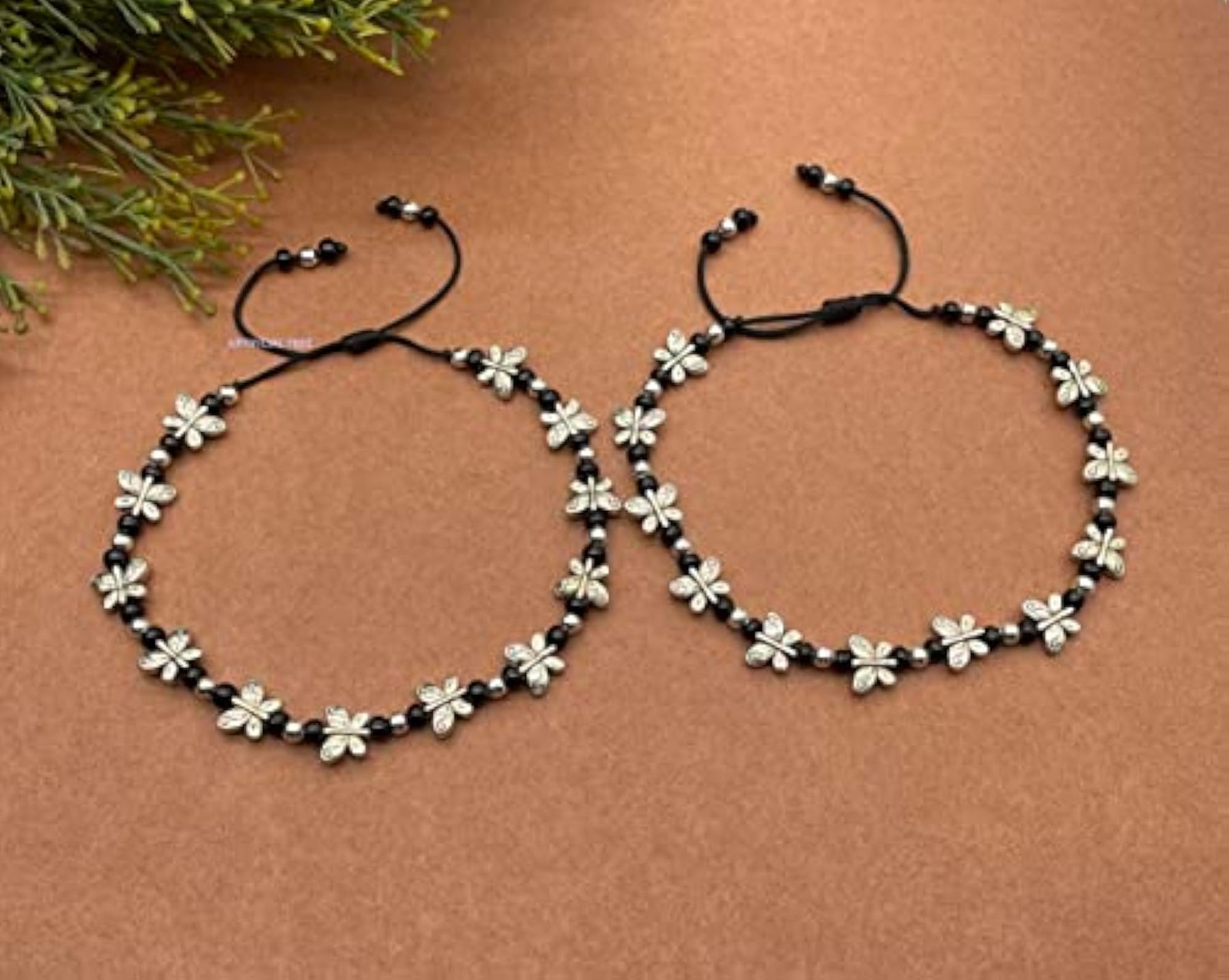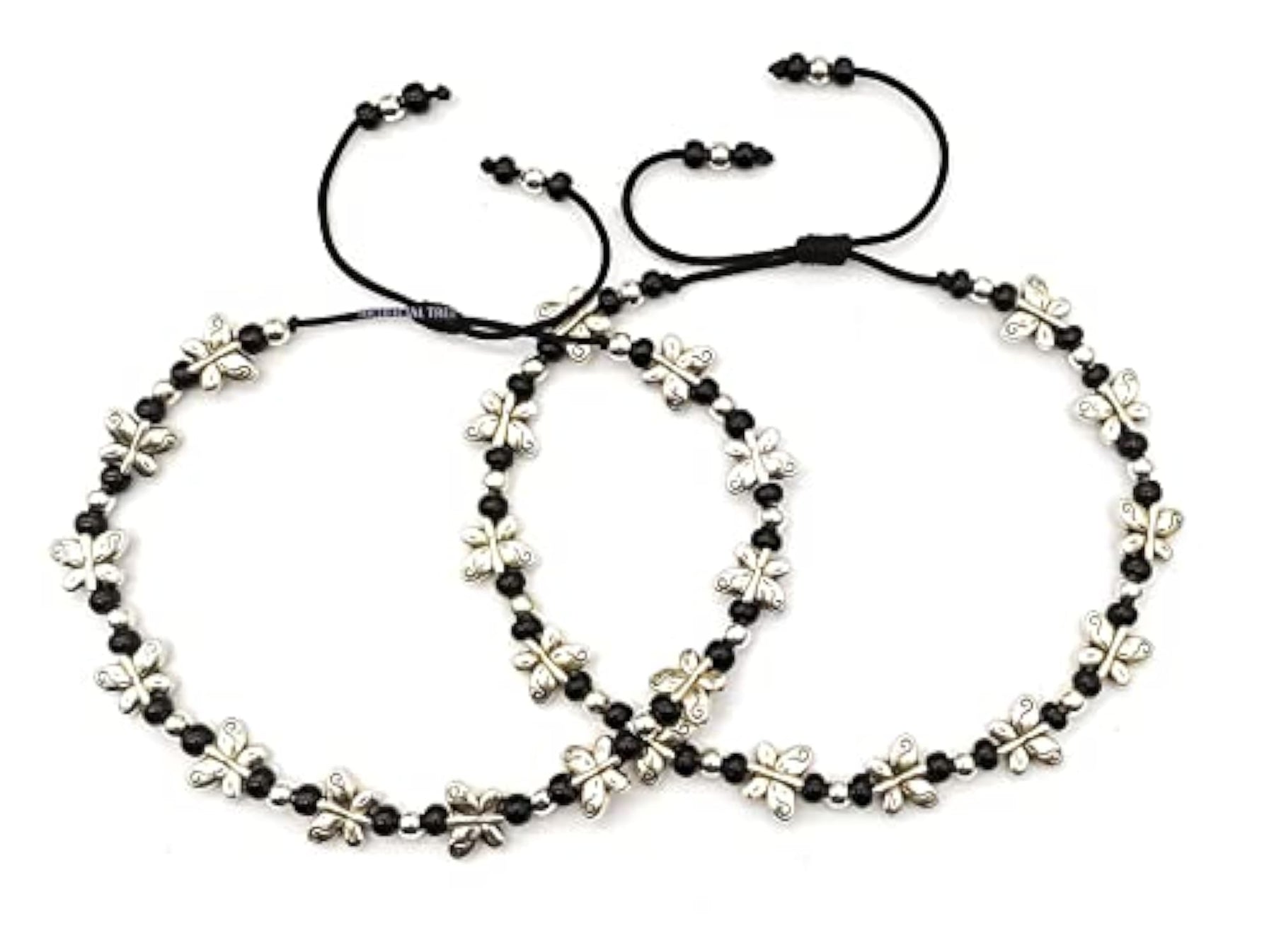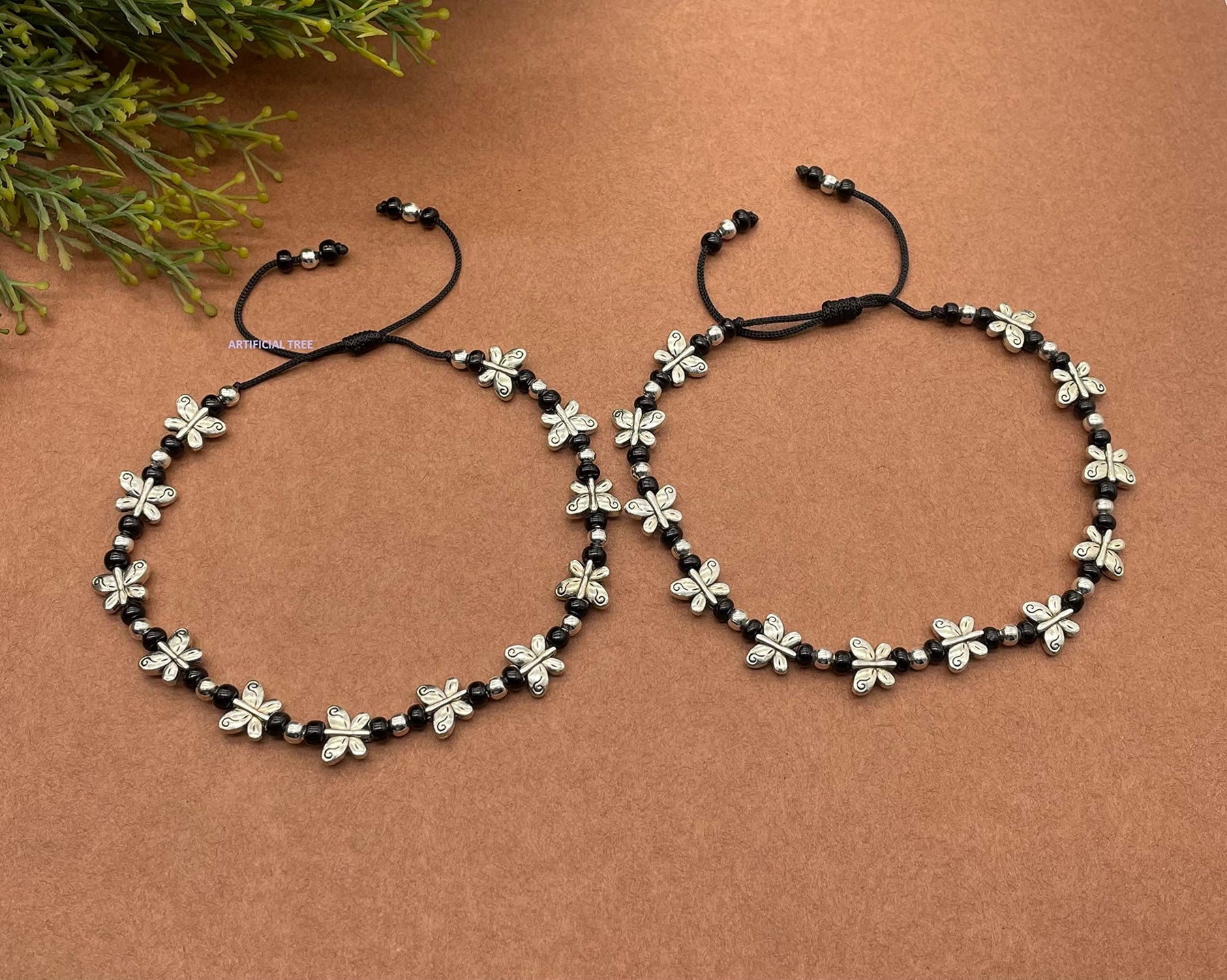 Beautiful anklet featuring butterfly charms made of German silver. Thread adjustable design suitable for all sizes. Also works as a Nazar Battu.