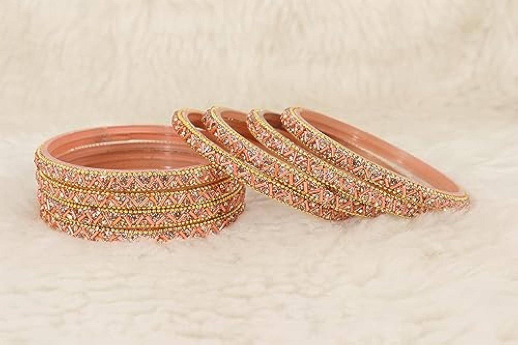Enhance your ethnic look with this set of 8 glass bangles featuring studded zircon gemstones and beads. Perfect for any occasion.