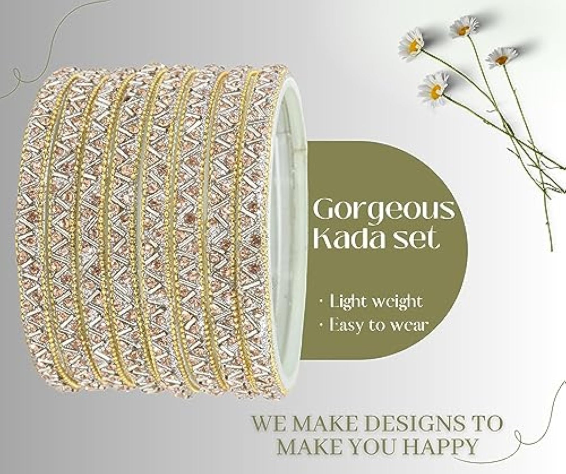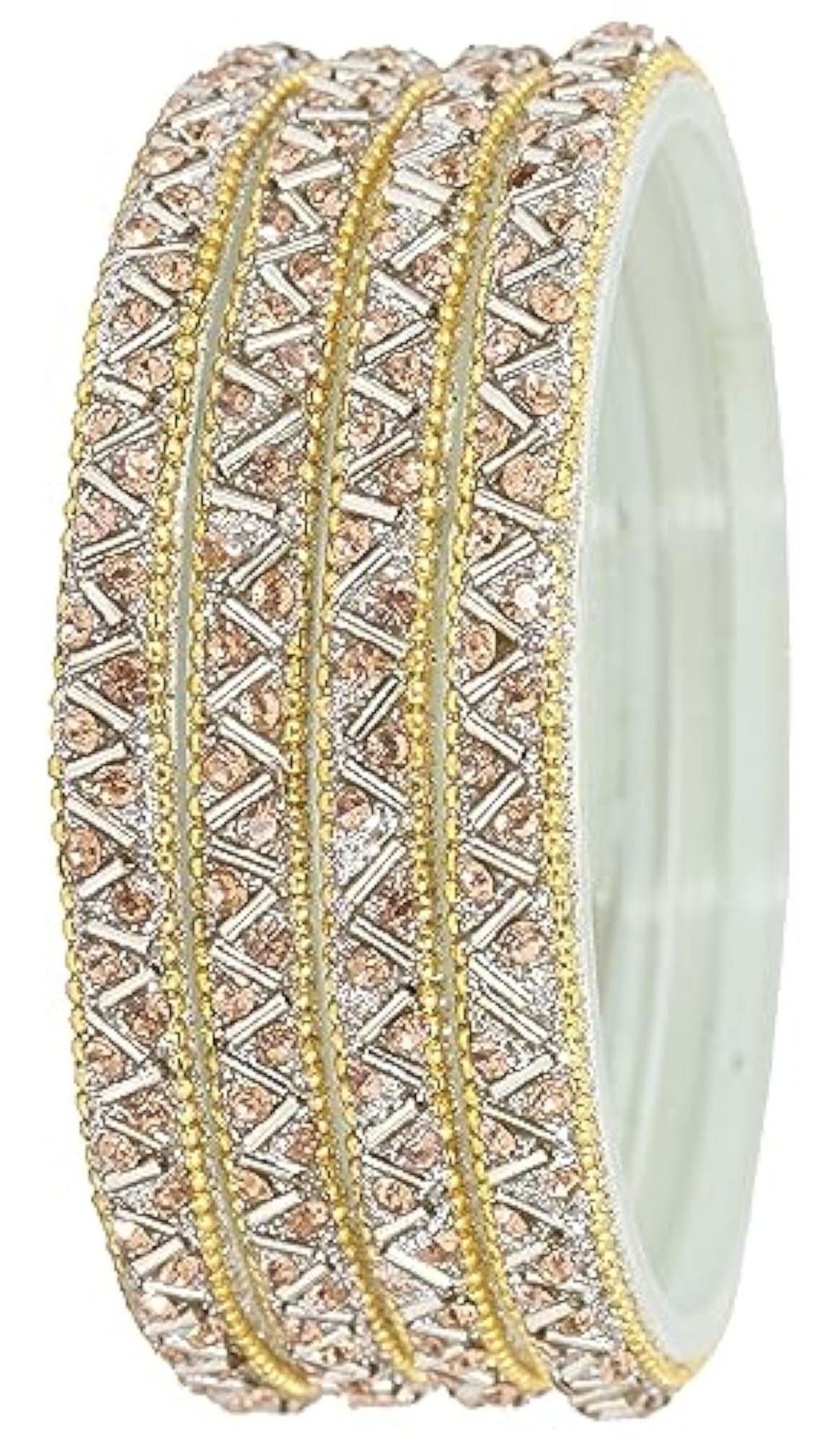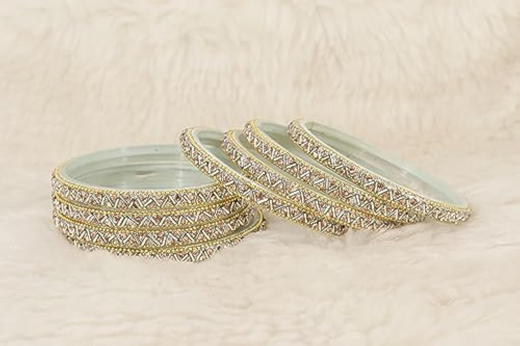 Elegant set of glass bangles studded with zircon gemstones and beads. Perfect for women. Pack of 8 bangles in assorted colors.