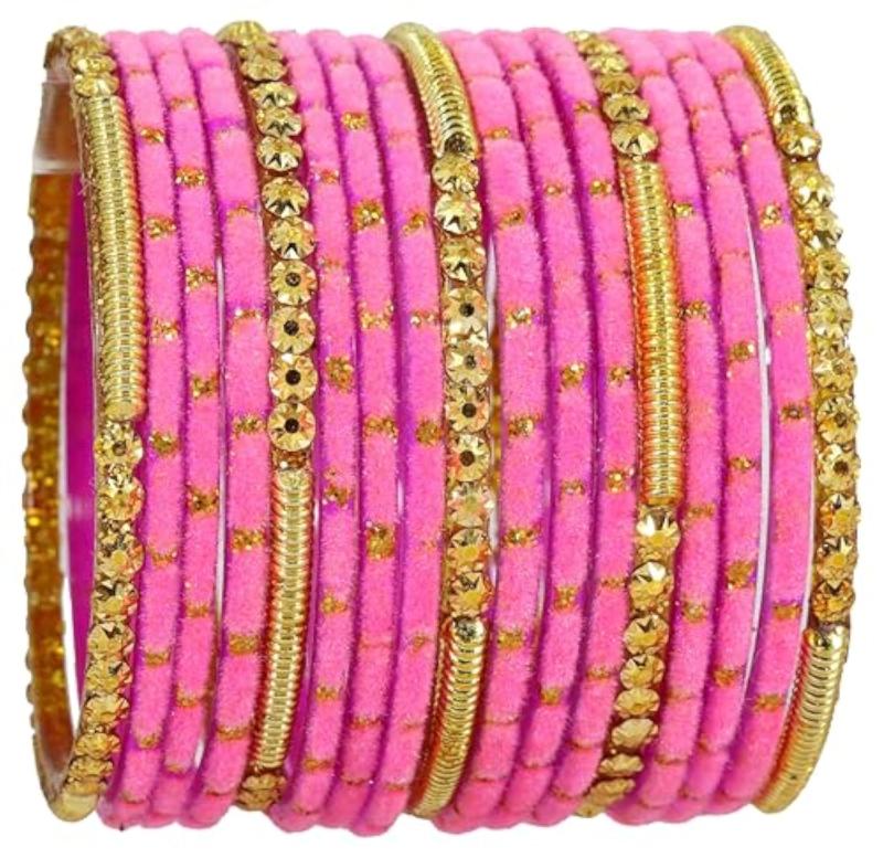 Elegant set of velvet bangles with golden glass beads and polka dots design. Perfect for a stylish look at any occasion.