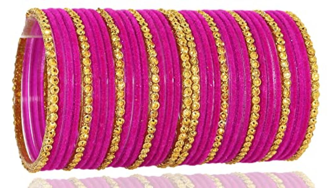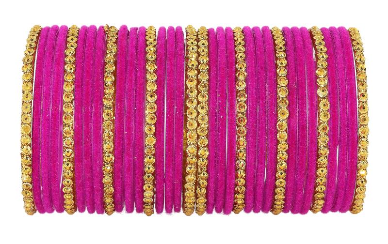 Elegant bangle set featuring glass and golden beads on velvet material. Perfect for adding a touch of sophistication to your traditional outfit.