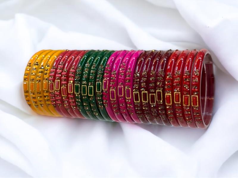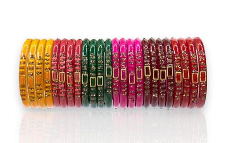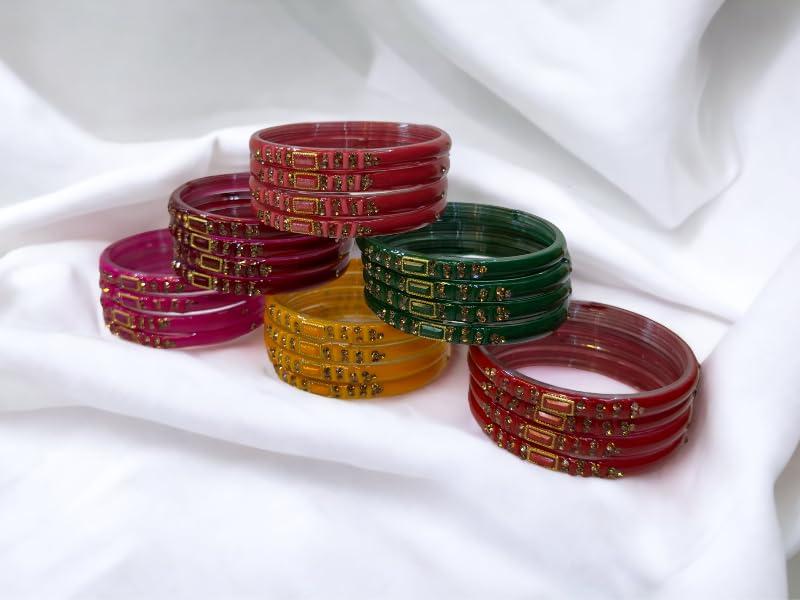 Beautifully crafted glass bangles adorned with gemstones and stone work, features a glossy finish, available in Style 2 and size 2.60.
