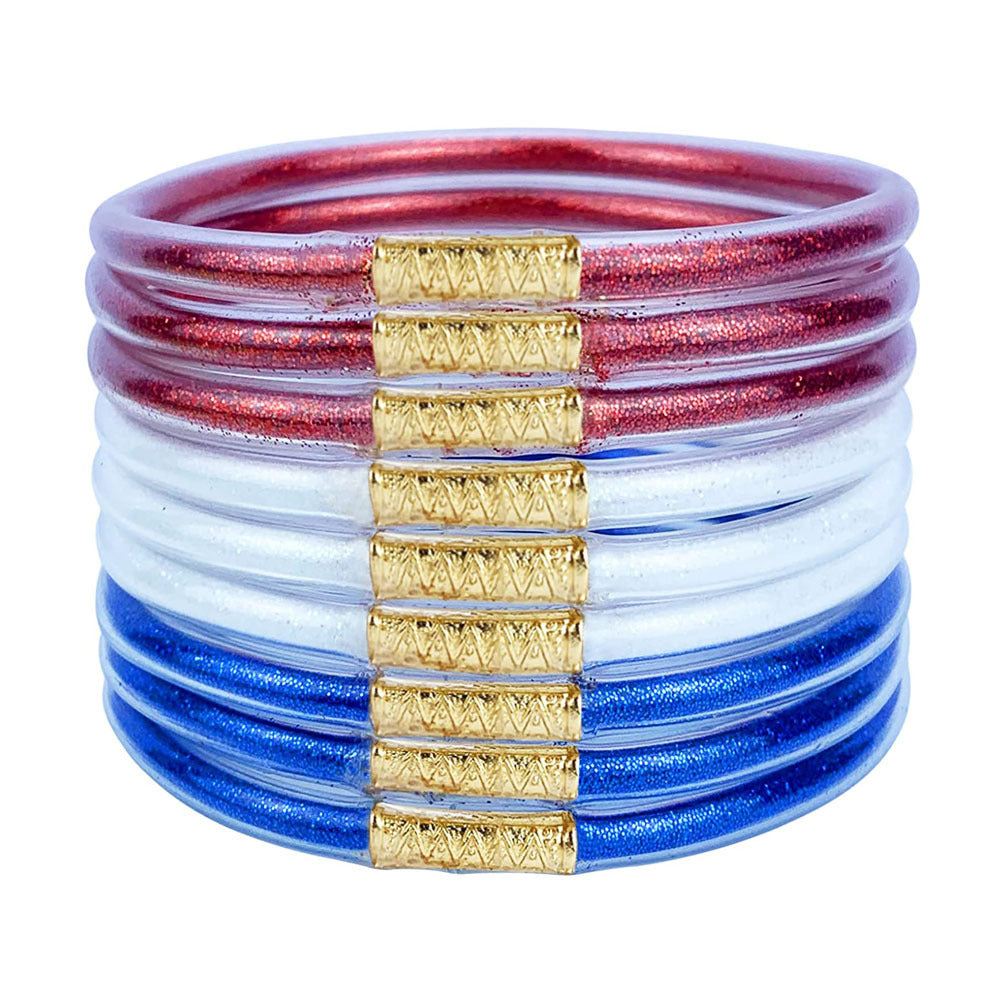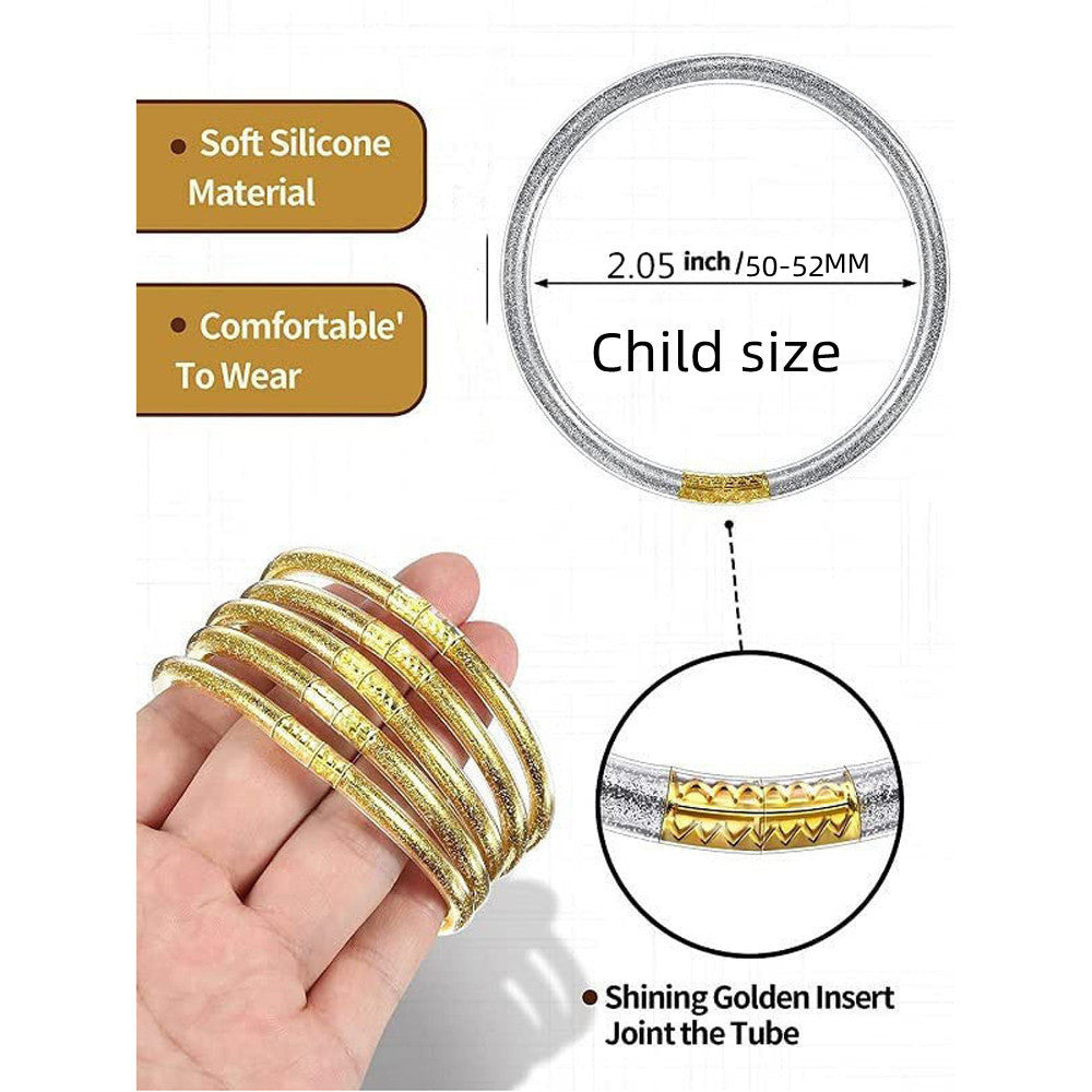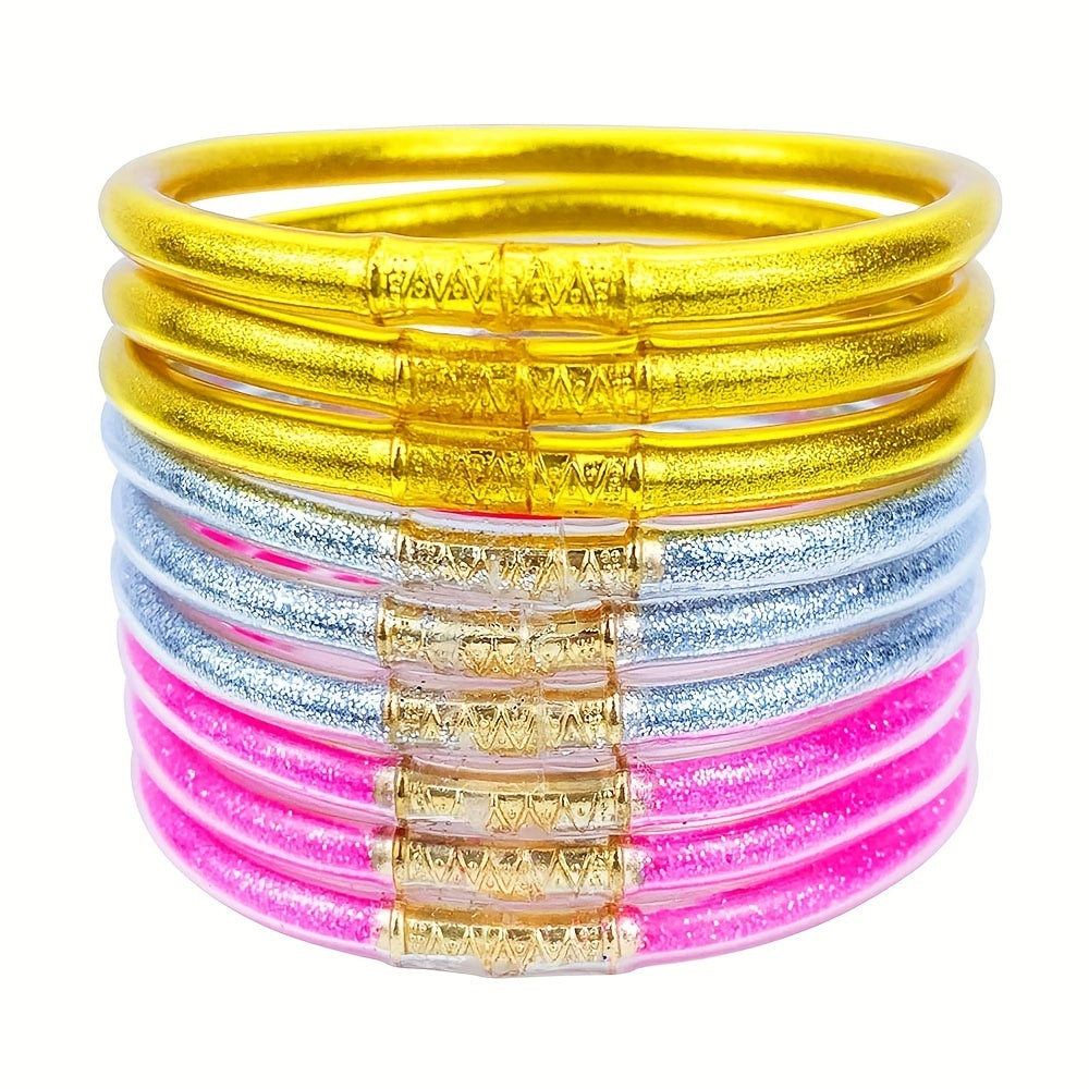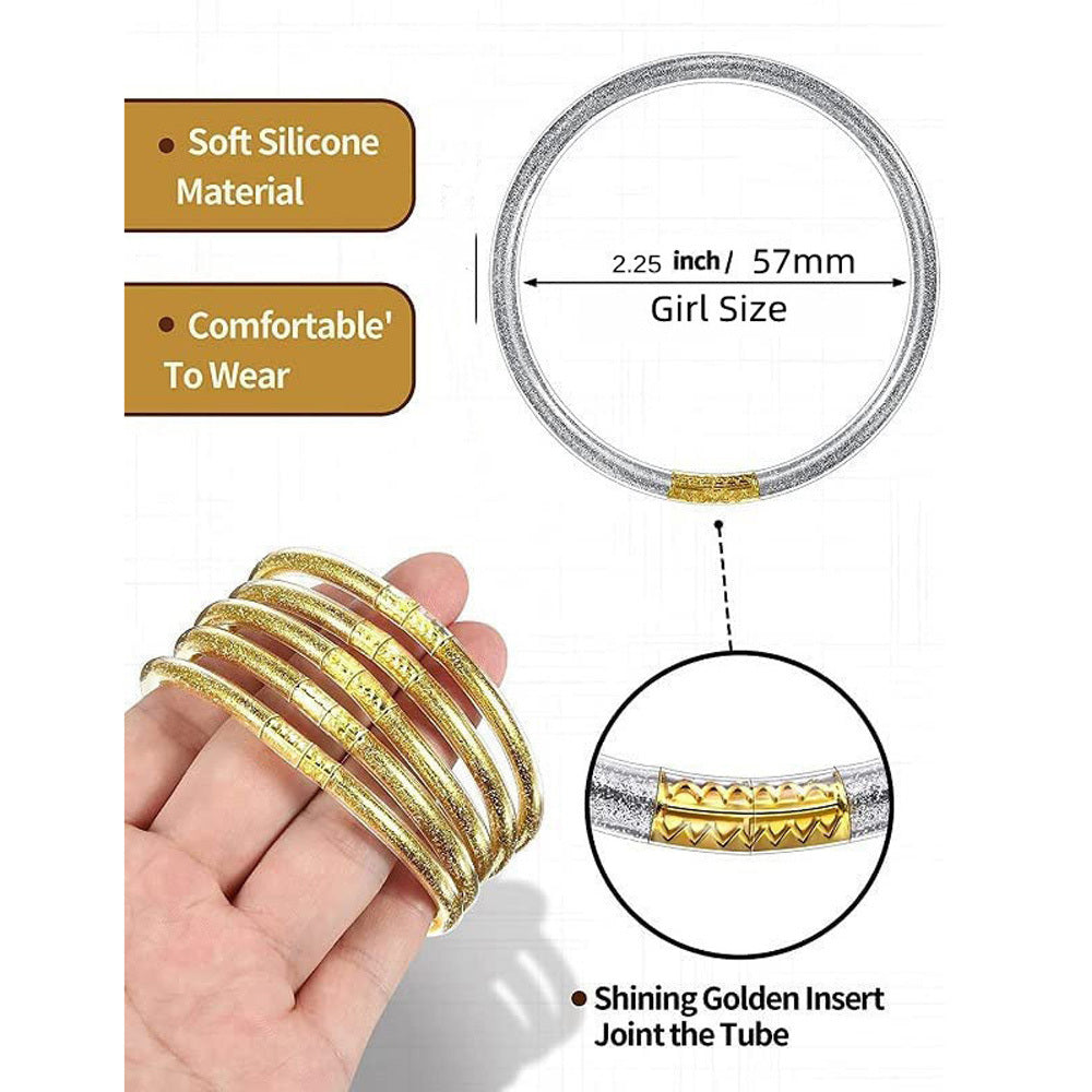 This set of glitter jelly bangle bracelets is perfect for women and girls to wear at parties, on the beach, or in the water. They are waterproof and durable, making them ideal for any occasion.