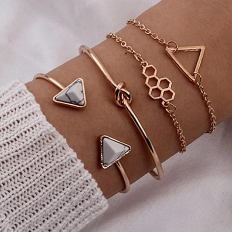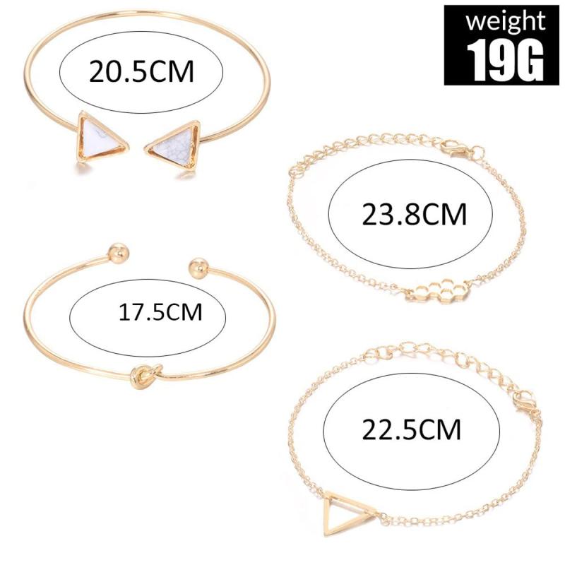 Elevate your style with this set of 4 contemporary stackable bracelets plated in gold-tone. These bracelets are versatile and perfect for everyday wear or special occasions.