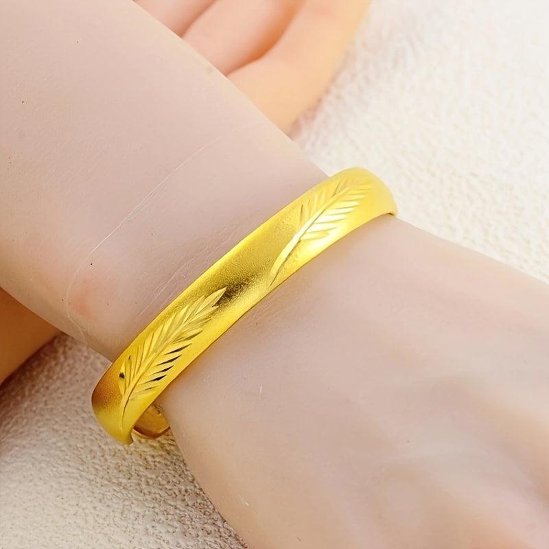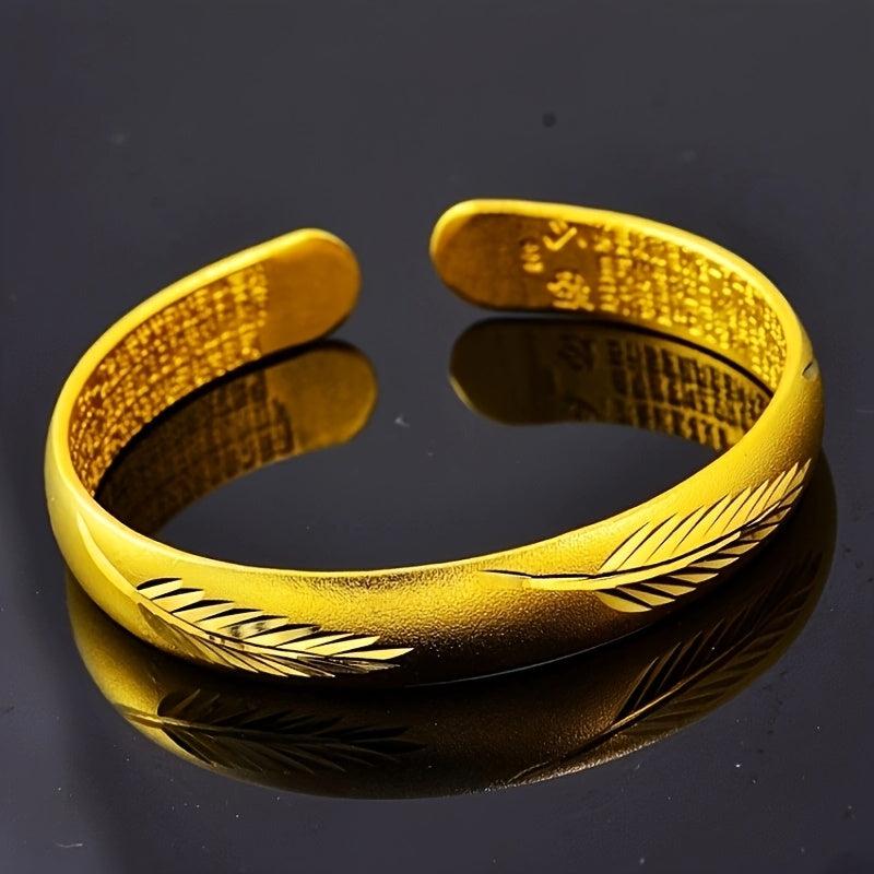 Elegant and unique jewelry piece inspired by ancient methods. Crafted with a golden feather design, this bracelet features the Heart Sutra symbol. Perfect for any special occasion.