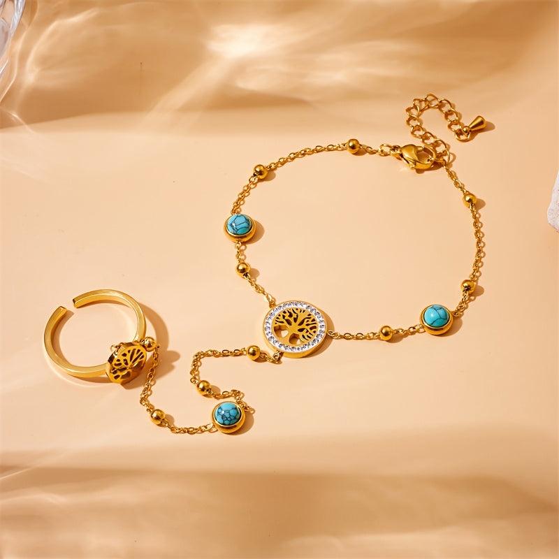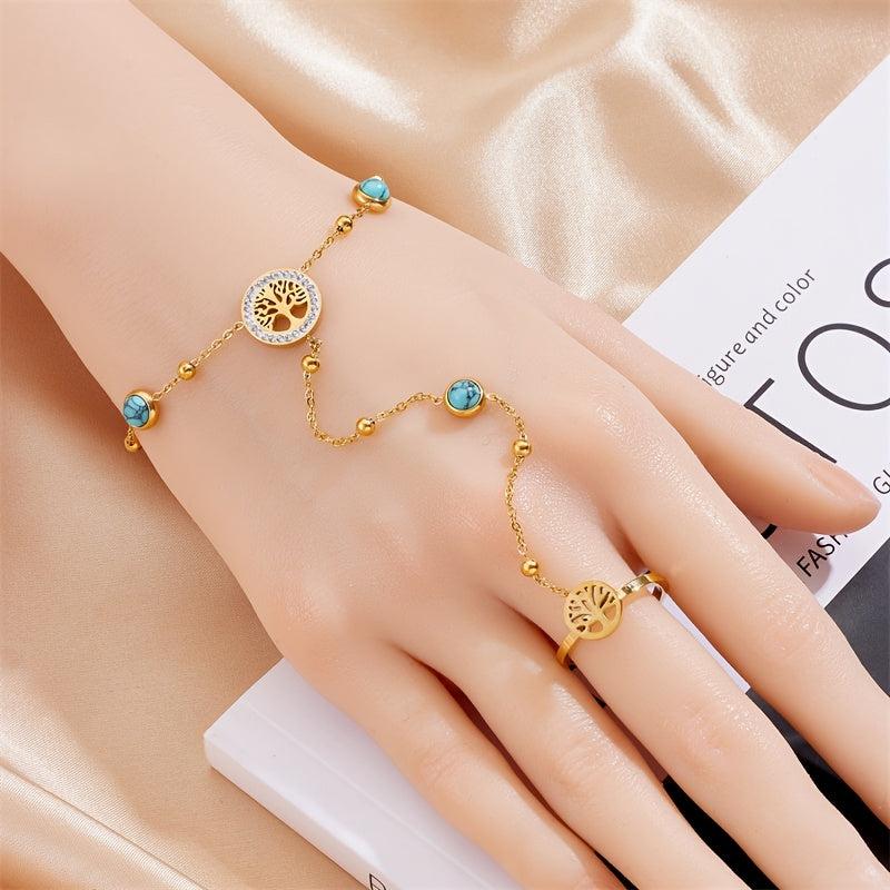 Elevate your style with this fashionable and versatile golden stainless steel bracelet ring combination set. It features a Tree Of Life decoration and is suitable for any occasion.
