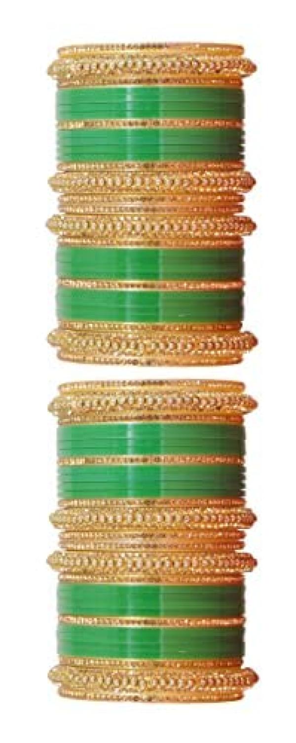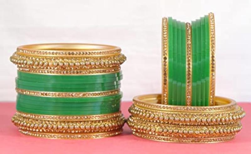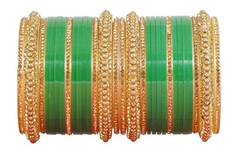 Elegant traditional bridal chuda set with golden stones and acrylic design. Perfect for Punjabi chura chooda ban ceremonies.