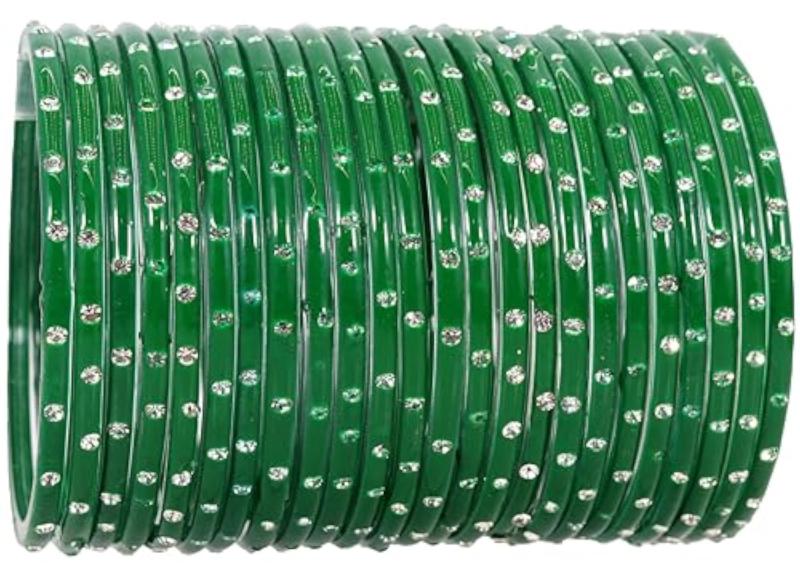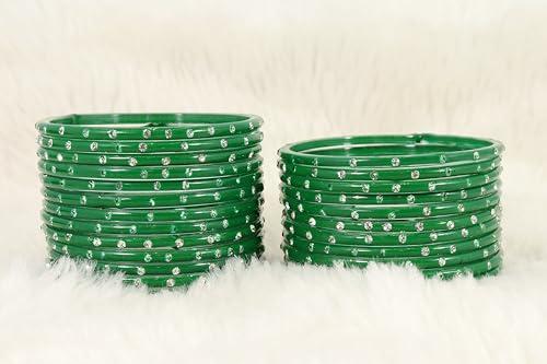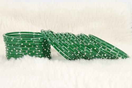 Elegant green glass bangle set perfect for weddings, anniversaries, and parties. Includes 24 fancy chudi bangles.