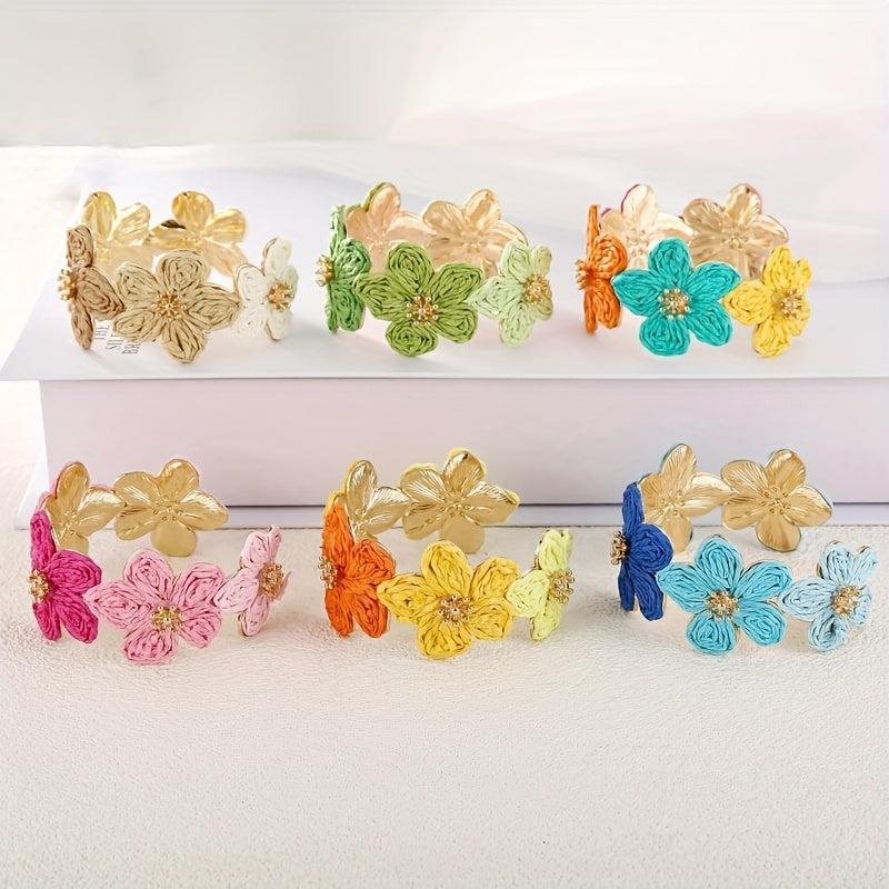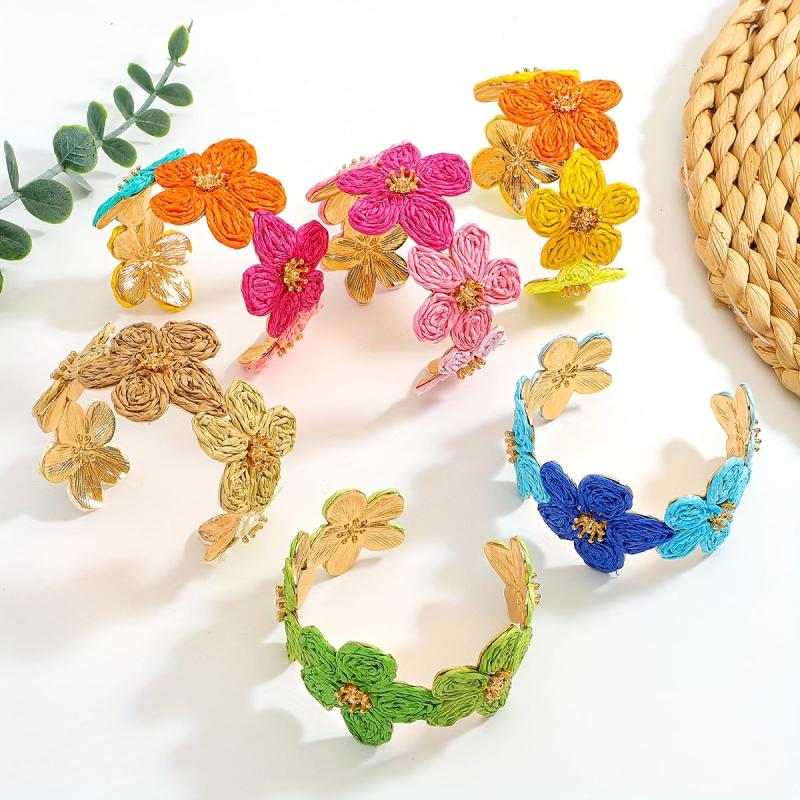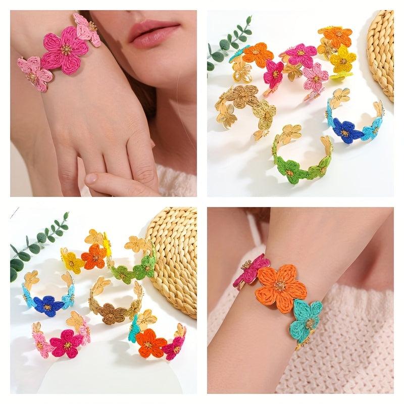 This gorgeous bracelet features vibrant floral designs on a handwoven raffia band with golden accents. Perfect for summer beach vacations or everyday wear, this jewelry makes a great gift for women year-round.