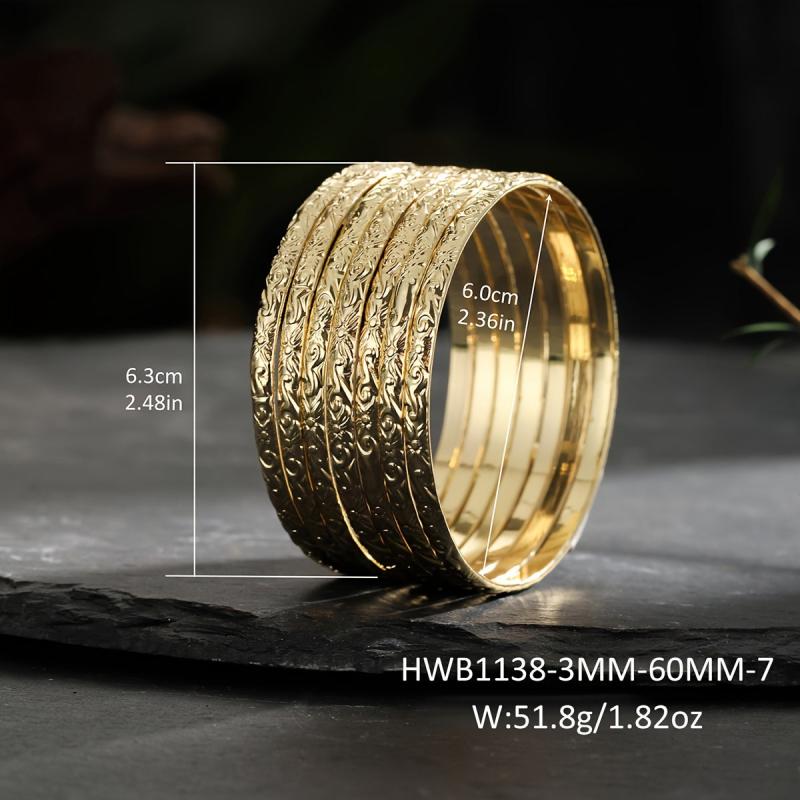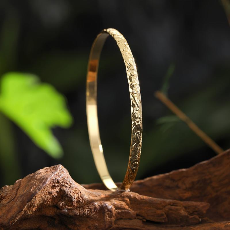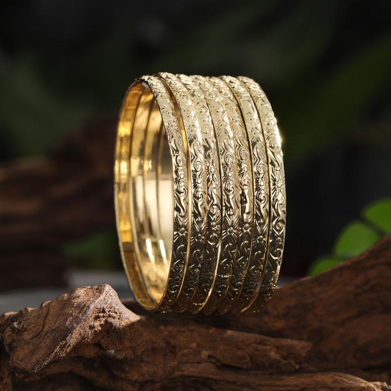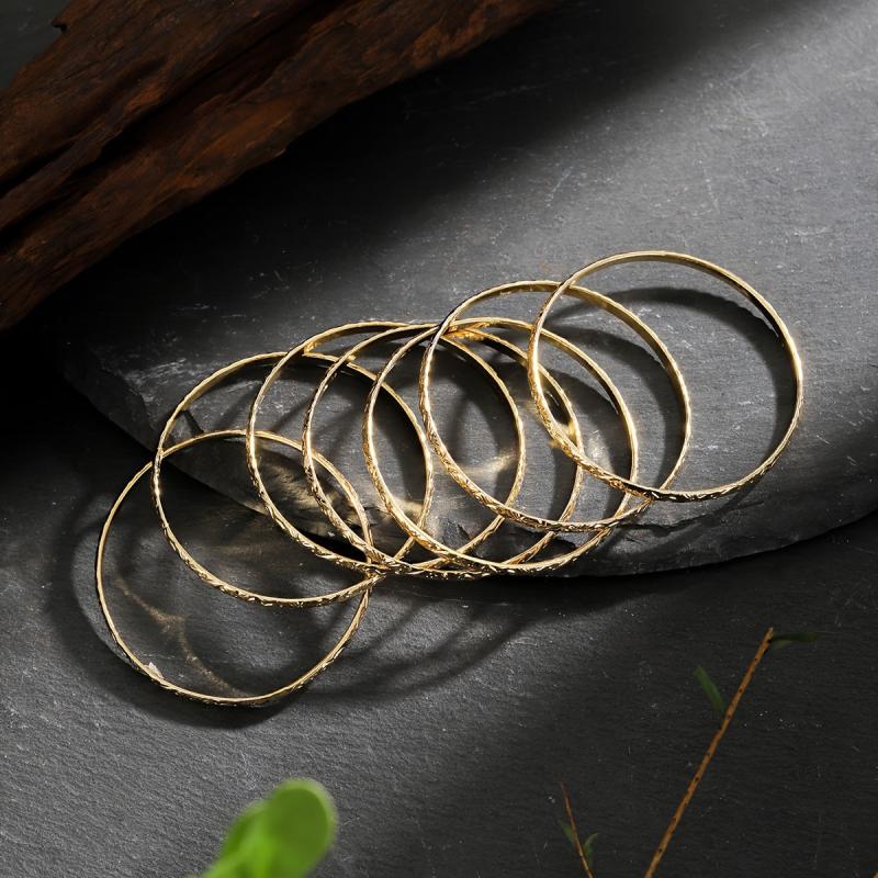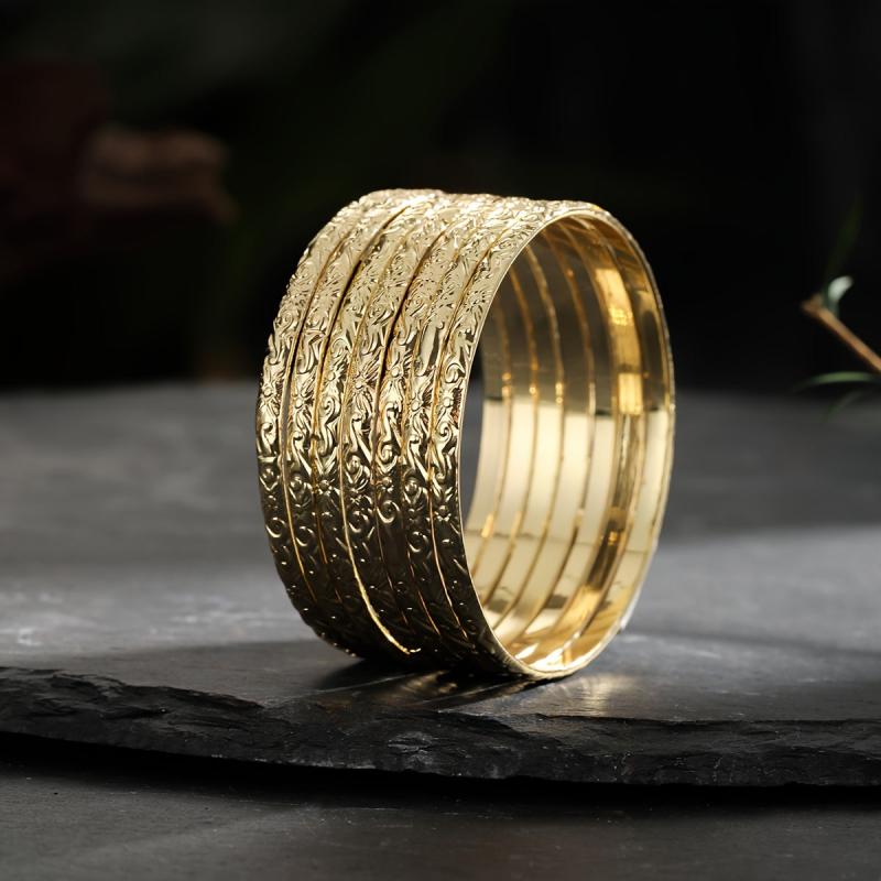 Elegant set of 7 bangles with a vine pattern, perfect for daily wear or vacation outfits. Made of 14K golden plated copper, these bracelets are versatile and fit all seasons.