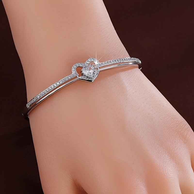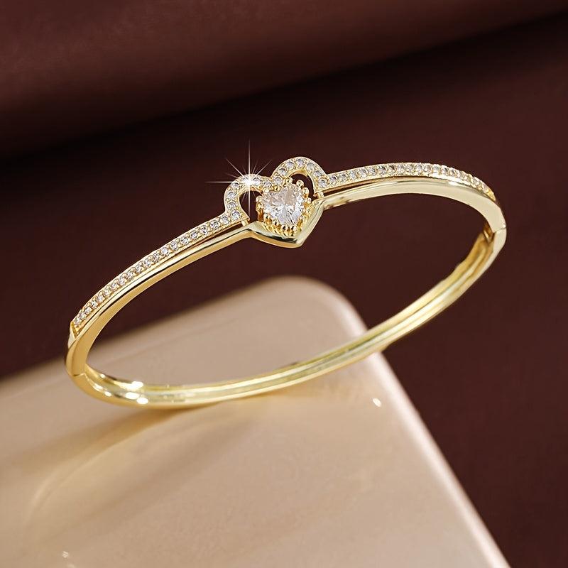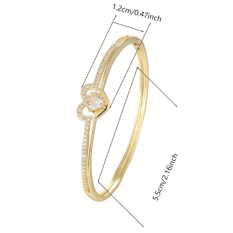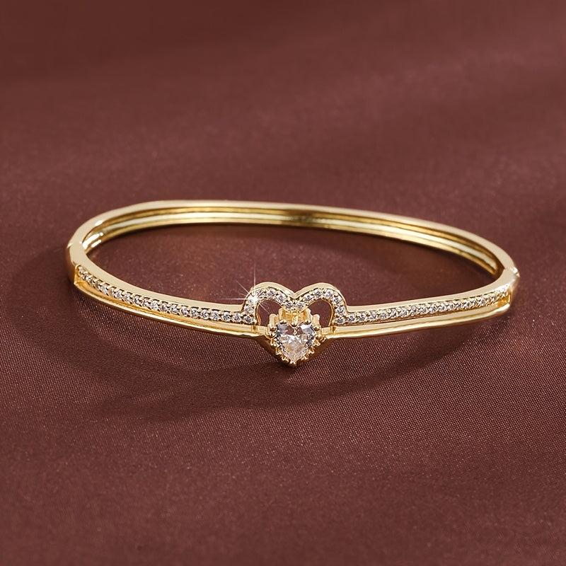 Add a touch of elegance with this heart-shaped cubic zirconia bracelet. The golden plated design makes it perfect for casual attire or as a gift idea. The durable and sparkling accessory will surely complement any outfit.