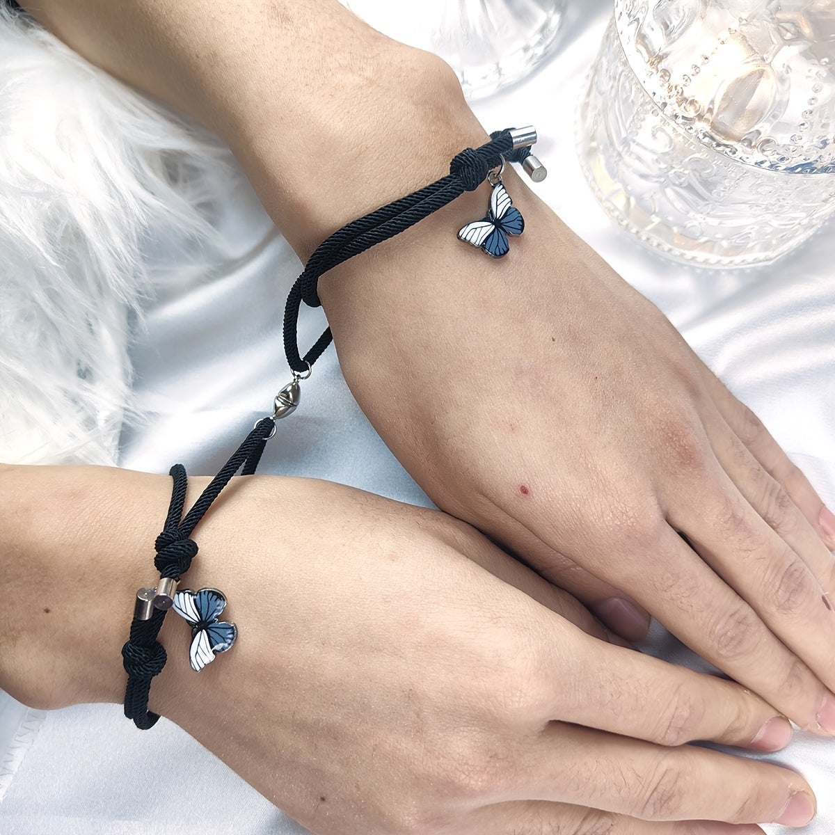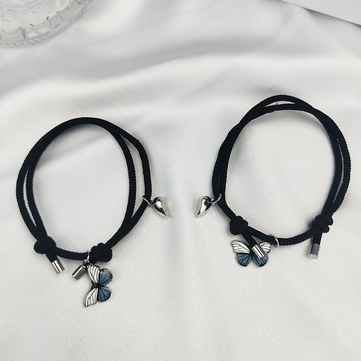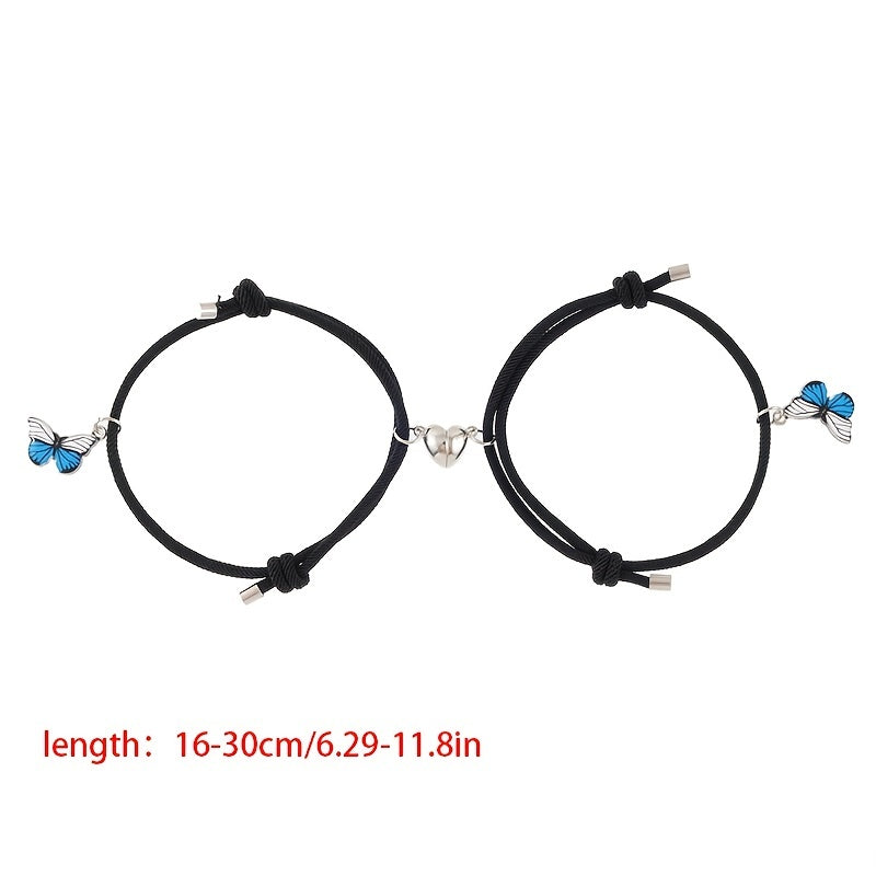 This bracelet set features heart magnet rope design with butterfly shape pendant. Perfect as a hand jewelry for couples or as a birthday gift.