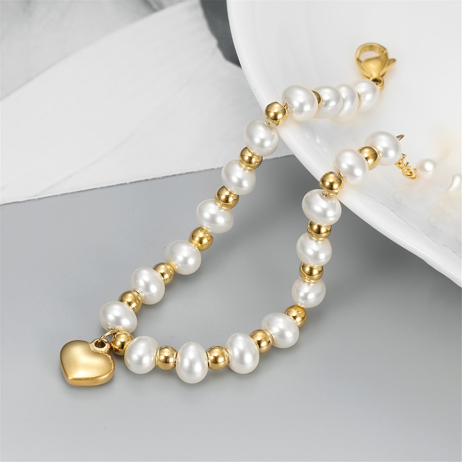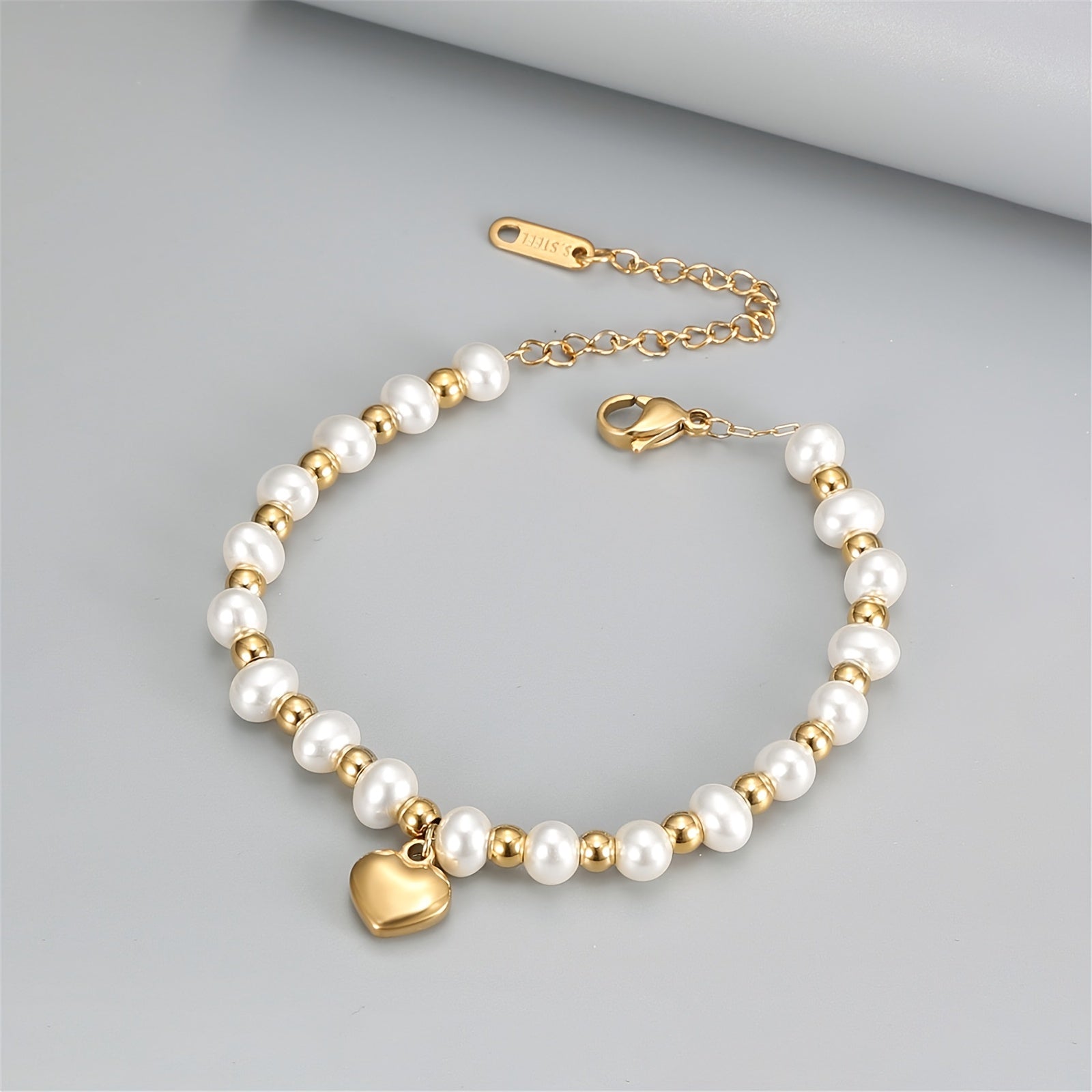 This elegant bracelet features a heart-shaped pendant with faux pearls and beads. Made of 18K plated stainless steel, it is a timeless piece of jewelry.