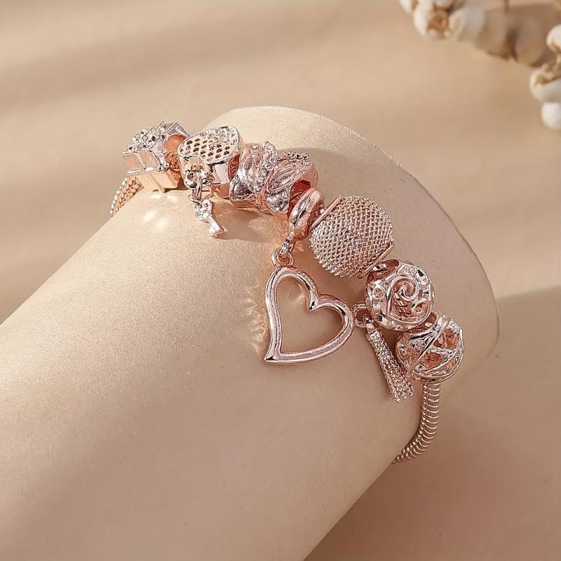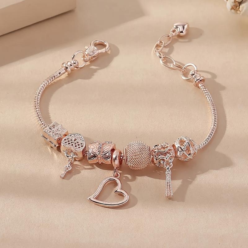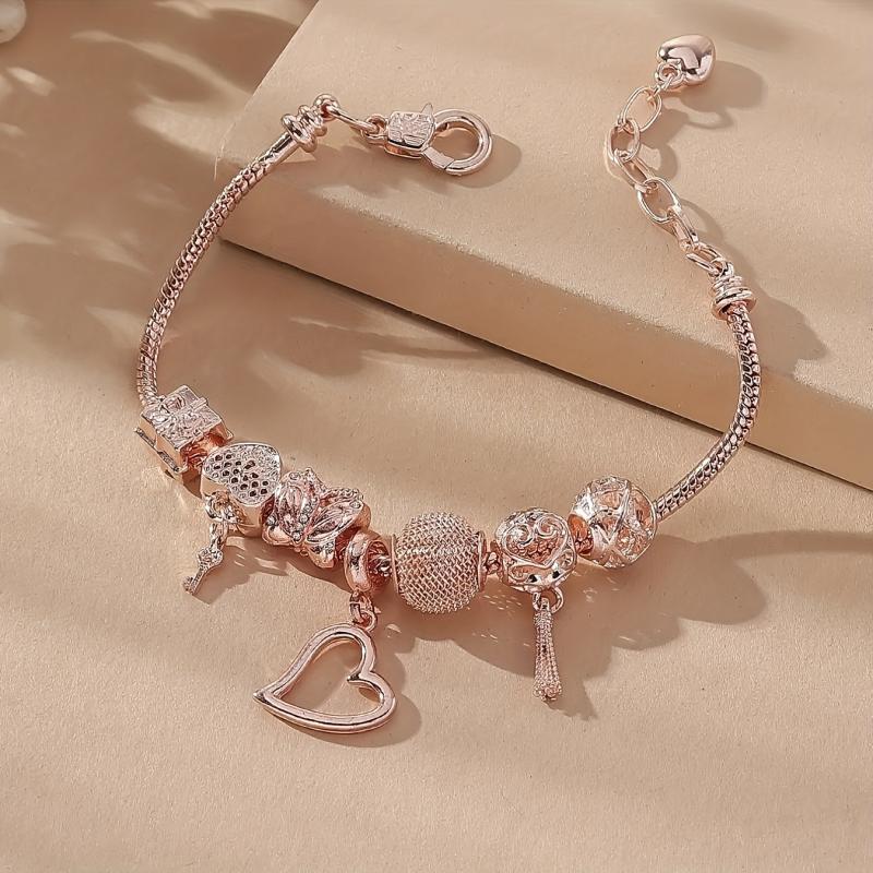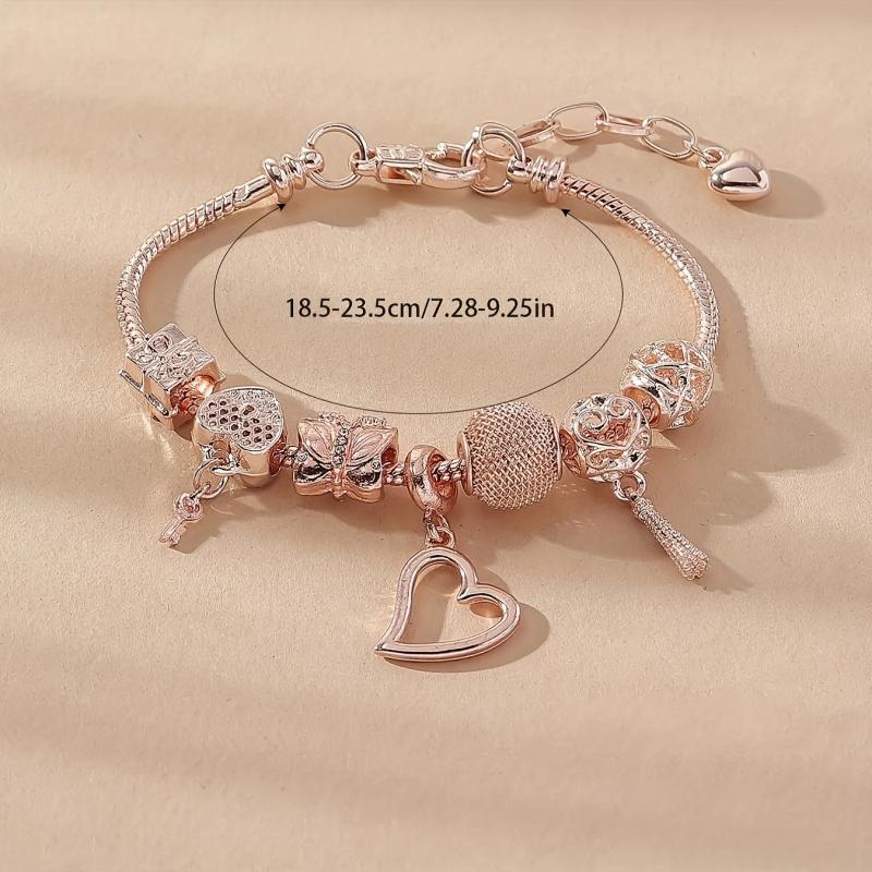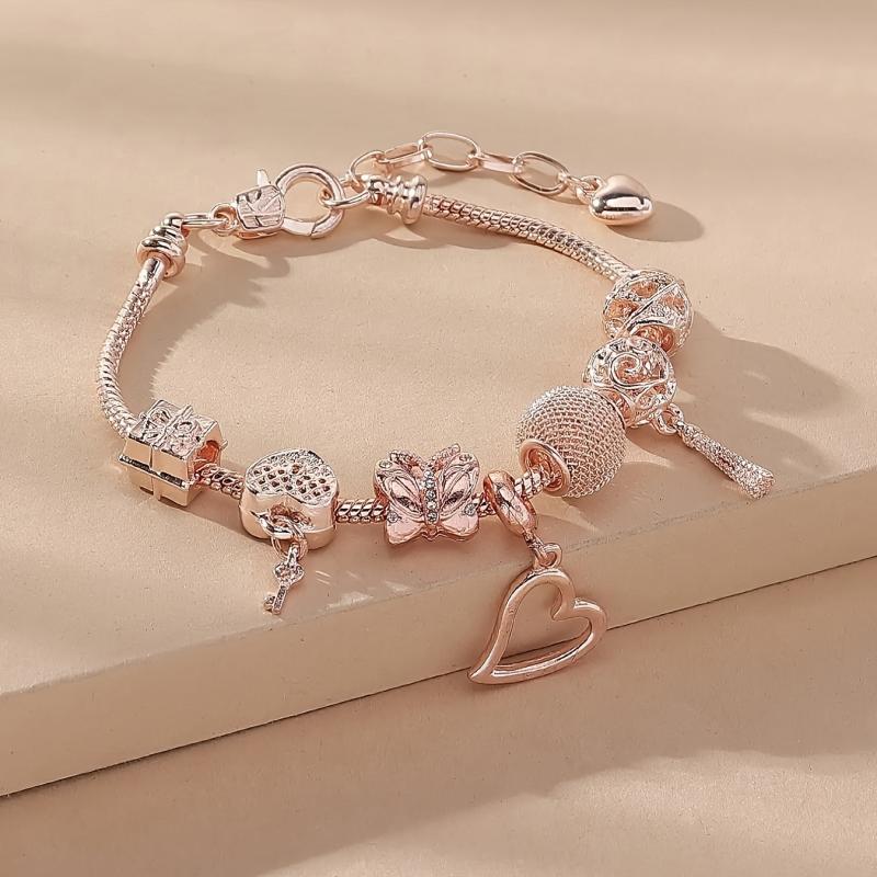 Elegant jewelry set with a heart pendant, butterfly bead, key charm, craft beads, and snake chain bracelet. Sparkling rhinestones add a touch of glamour.