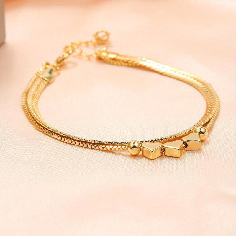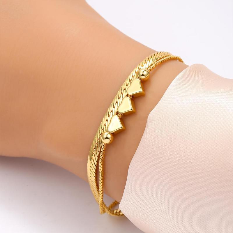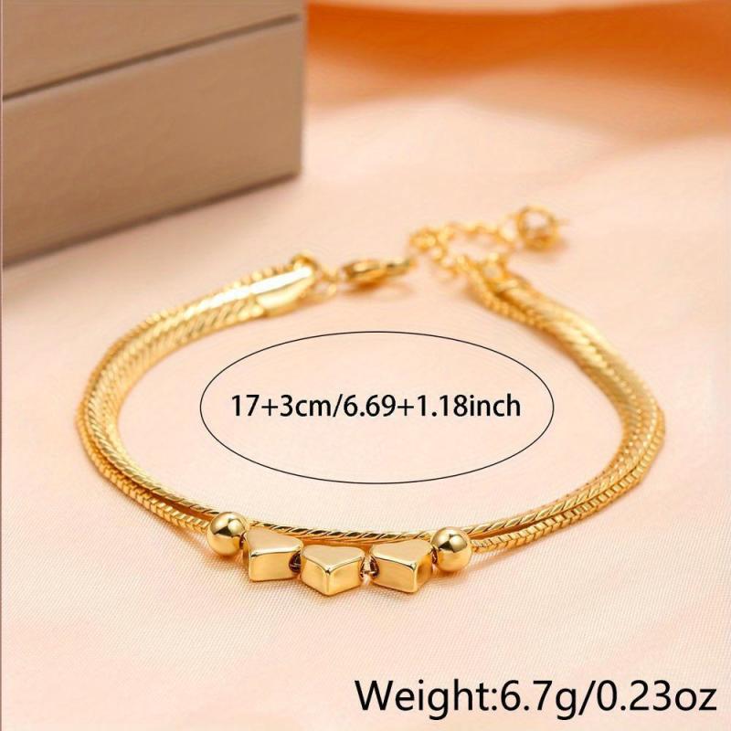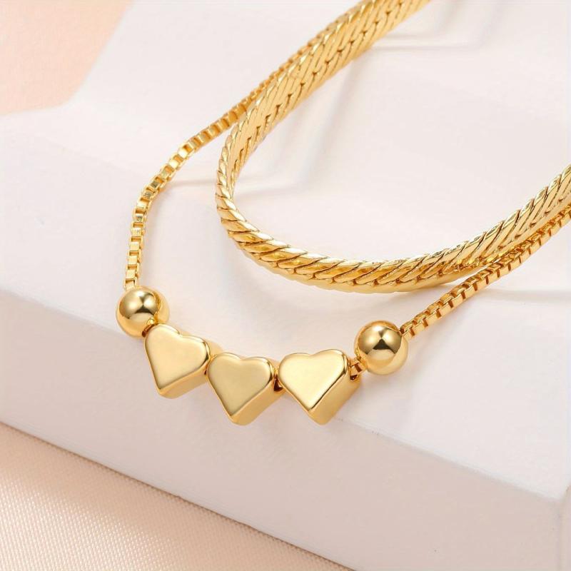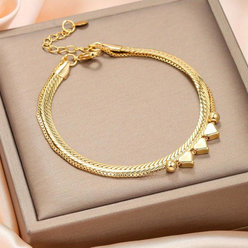 Elevate your style with this versatile heart shaped double layer snake chain bracelet. Perfect for everyday wear or special occasions, this golden tone minimalist jewelry accessory adds a touch of sophistication to any outfit.
