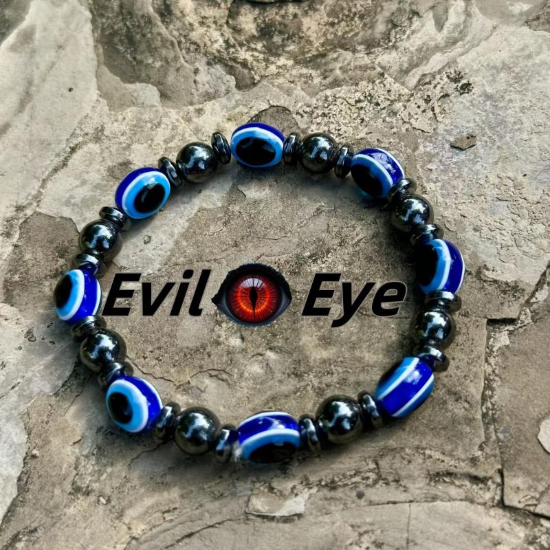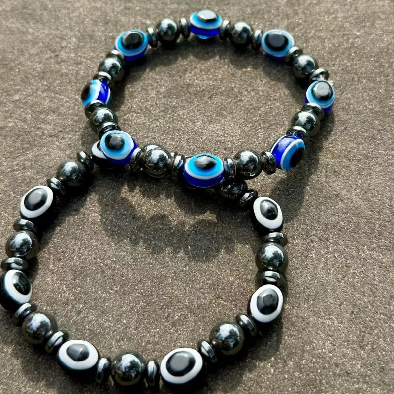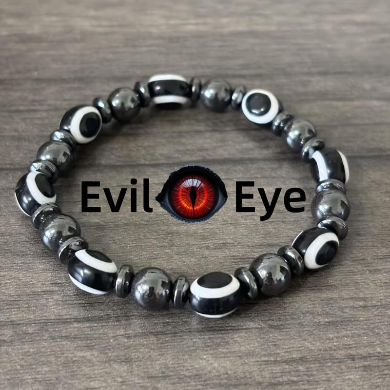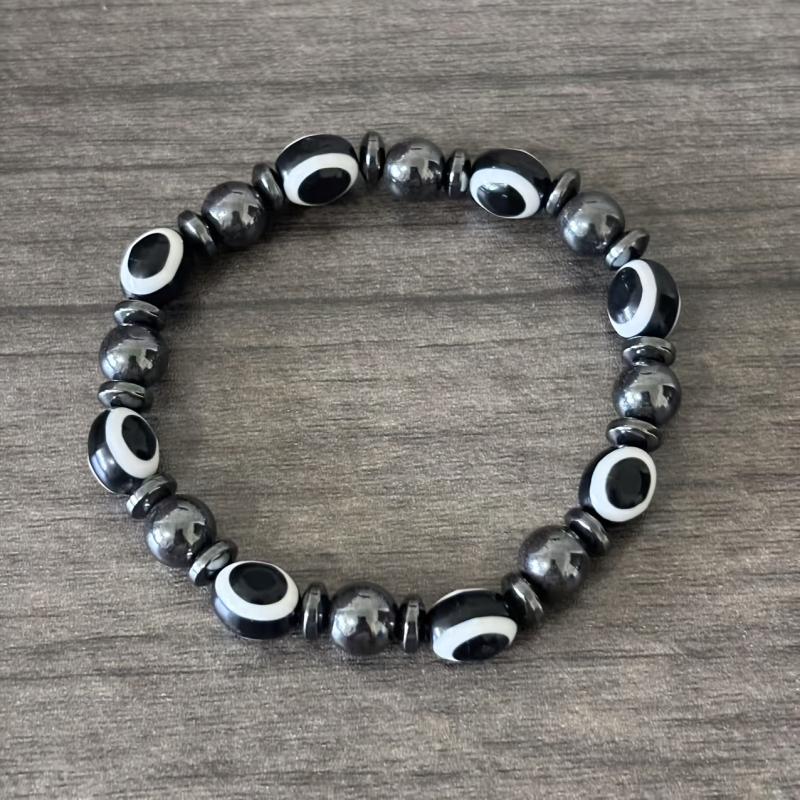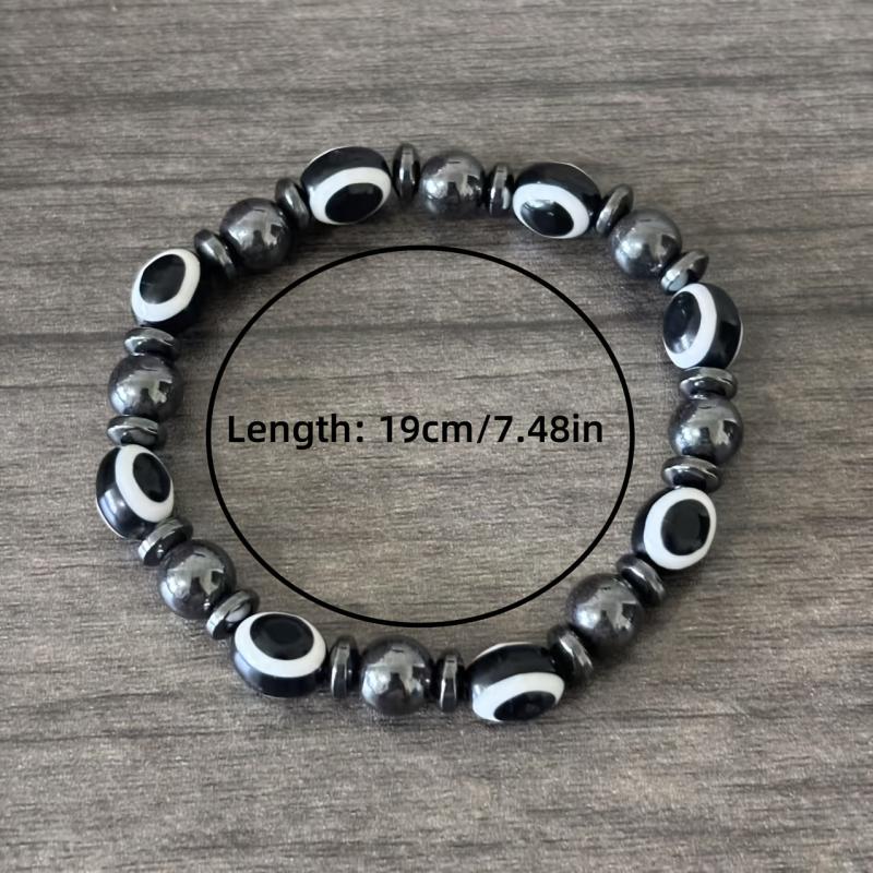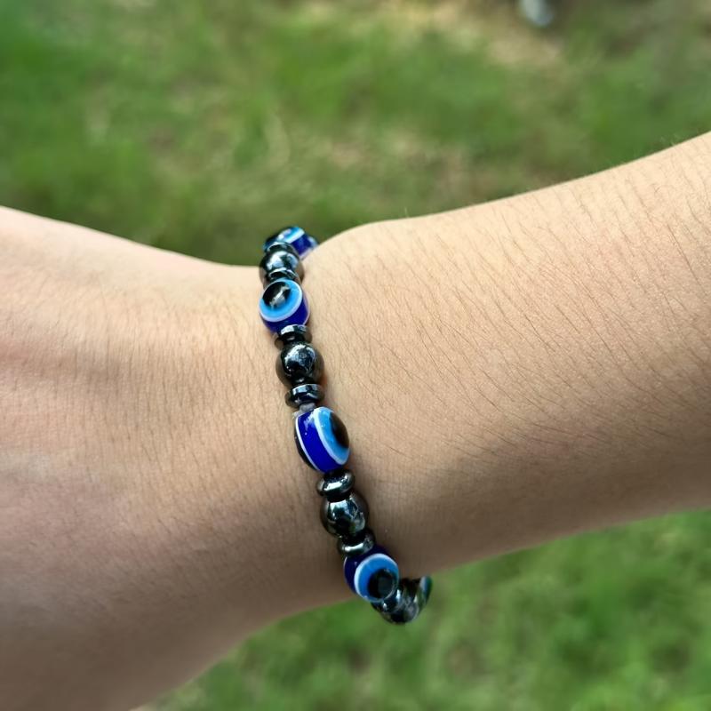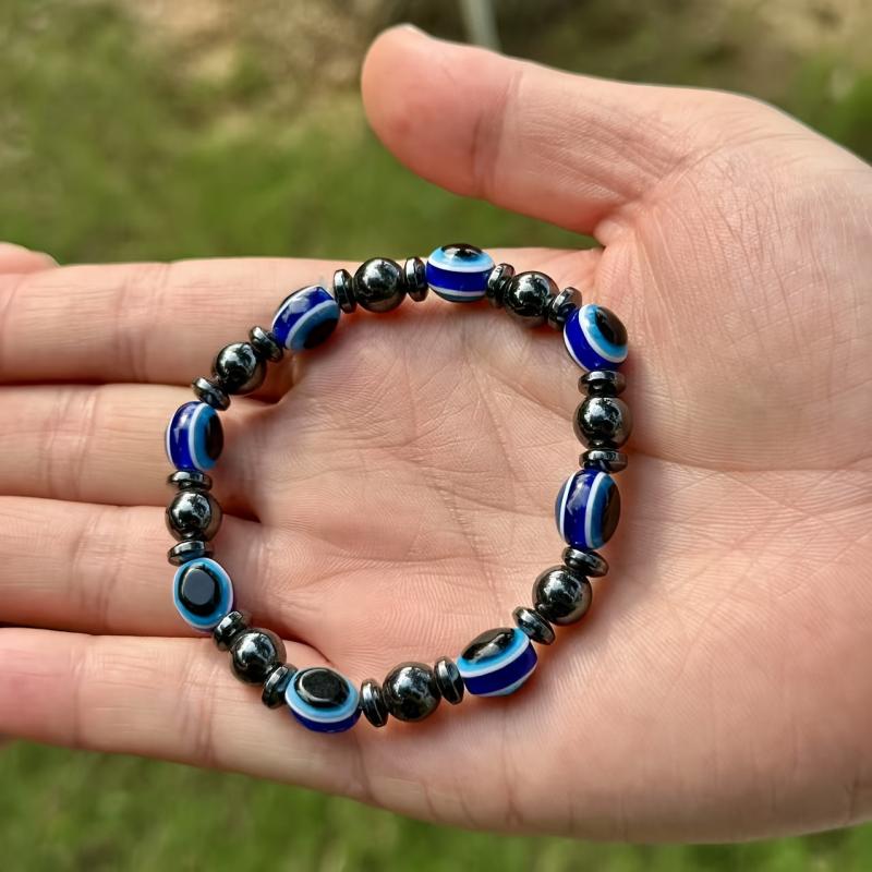 This hematite bracelet features an evil eye charm, perfect for daily wear or as a holiday gift. It is durable and stylish, suitable for men and women.
