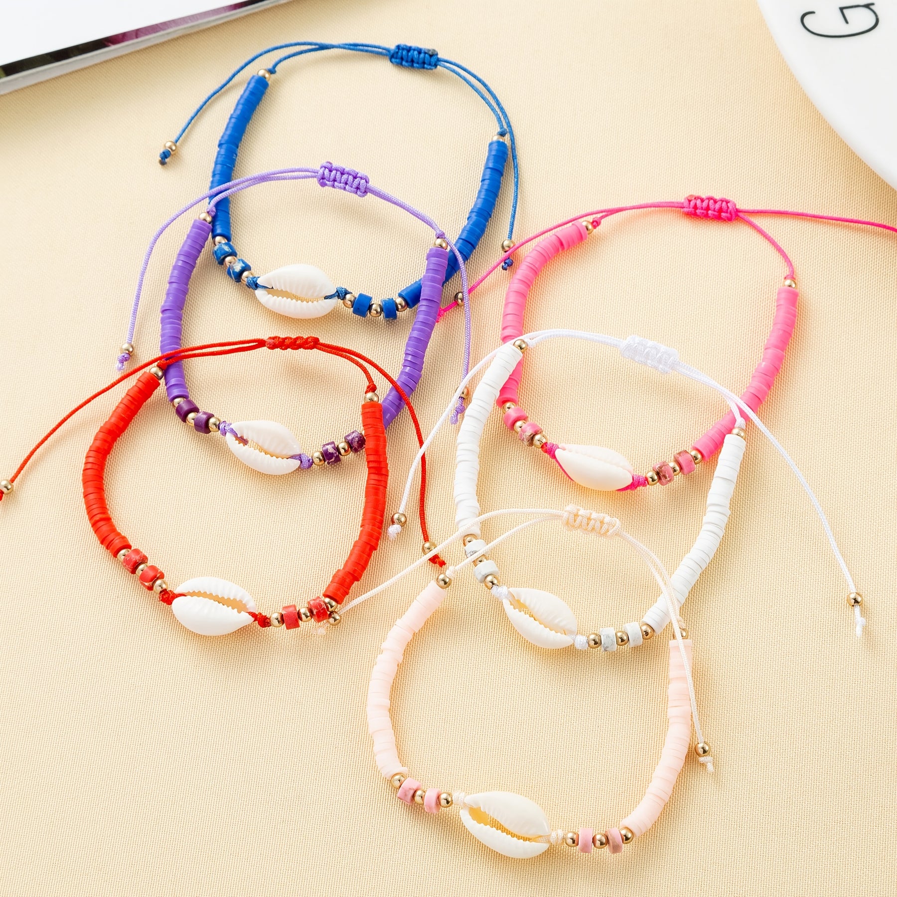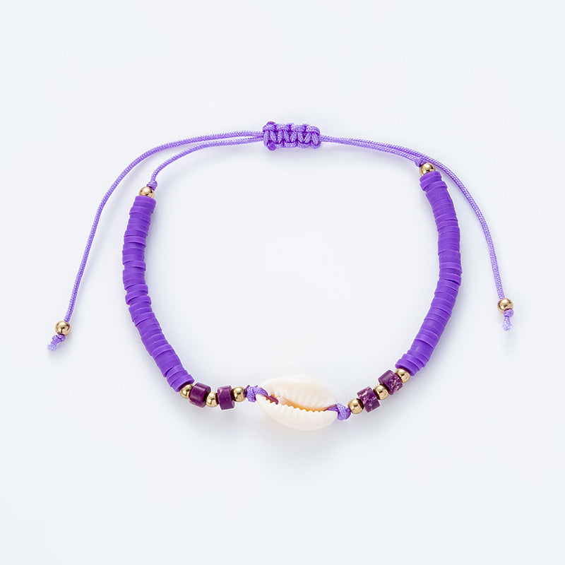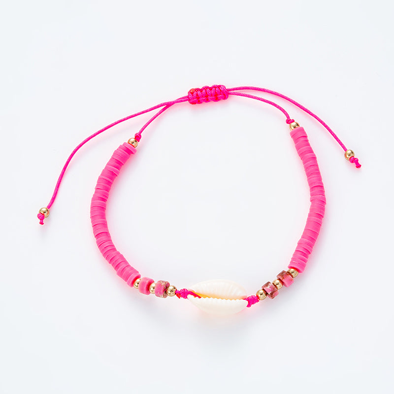 This bracelet features a hot ocean style design with shell gemstones and silicone beads. It is hand-woven and adjustable in length. Available in 6 colors.