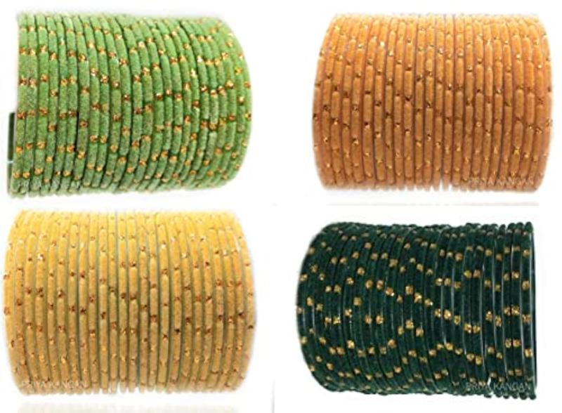 Indian Traditional Velvet Works Glass Bangles, Kanch Chudi Pack (96 Bangles)