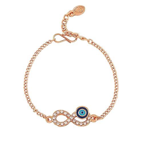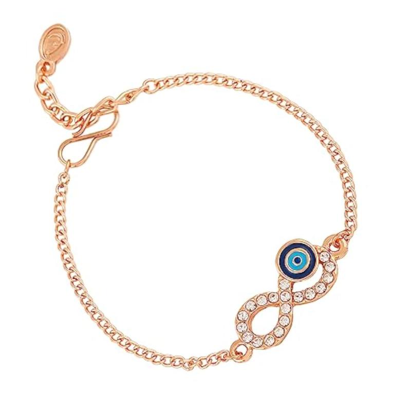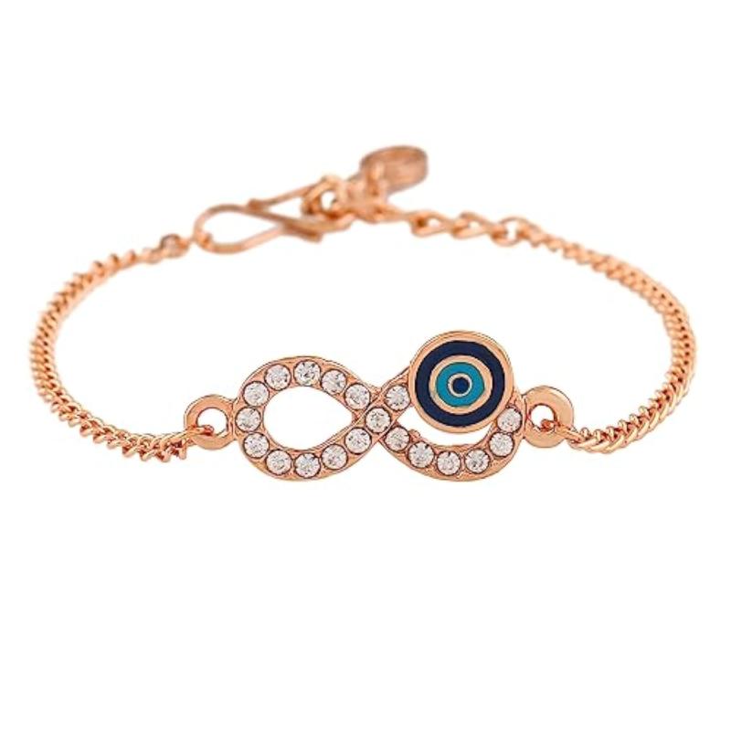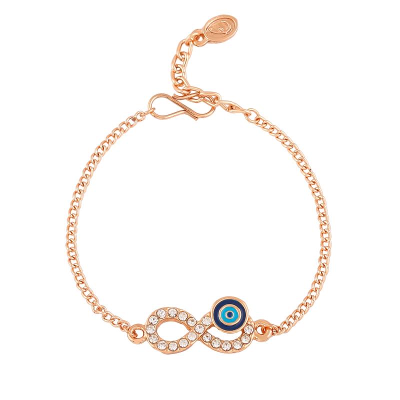 This sparkling bracelet features an evil eye design with an infinity symbol. A stylish and meaningful accessory for any occasion.