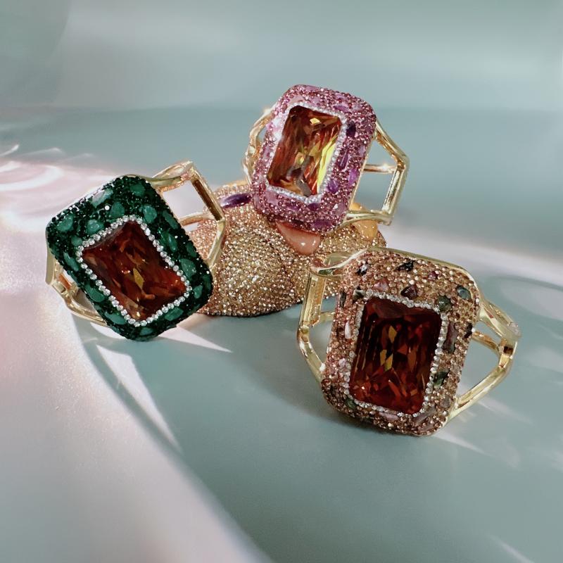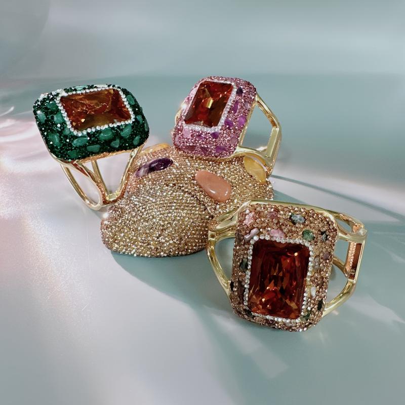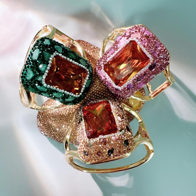 Handcrafted from iridescent synthetic Sudan stone using pure ceramic techniques. Features rhinestone accents.