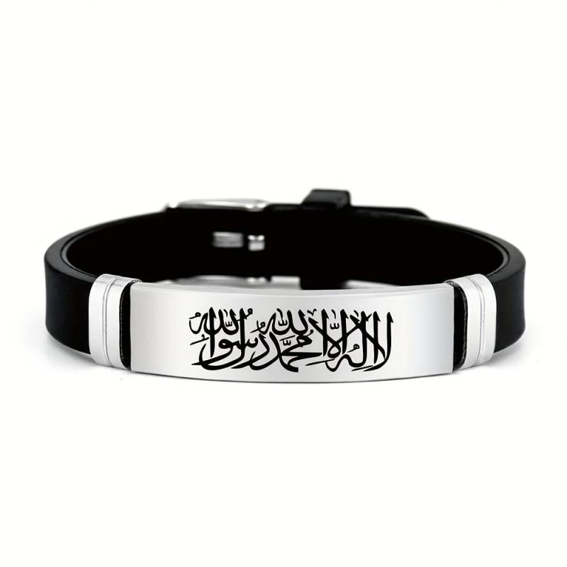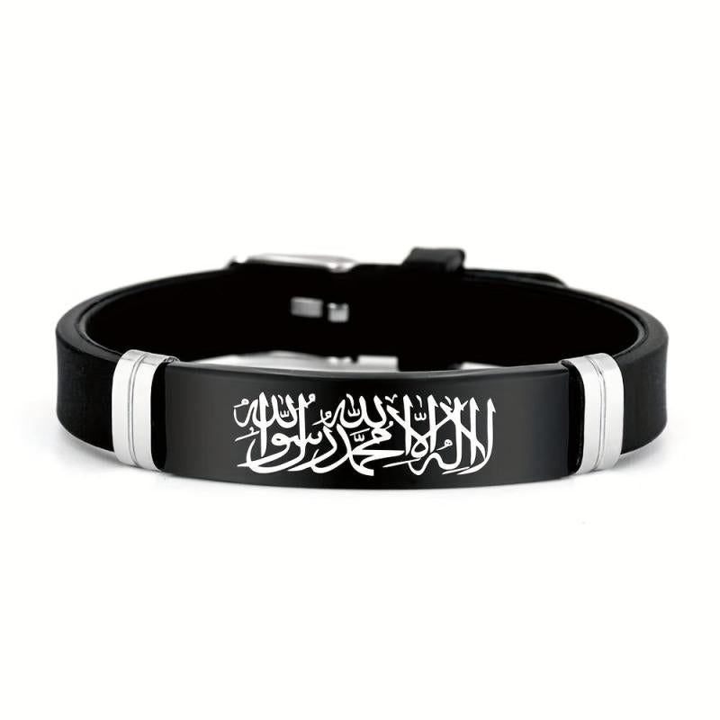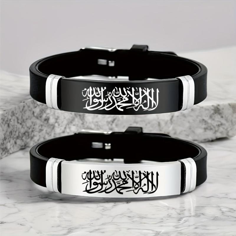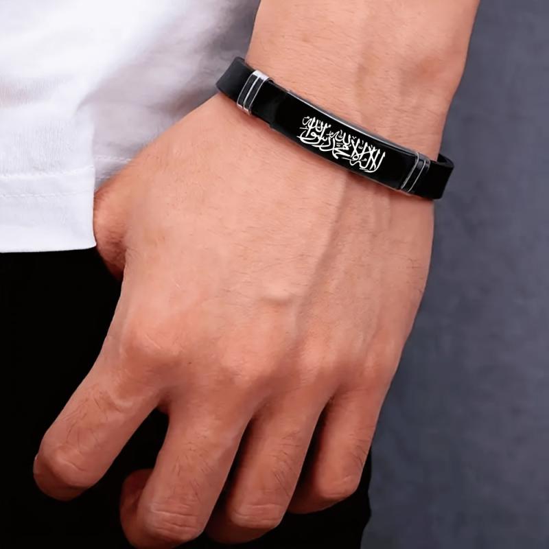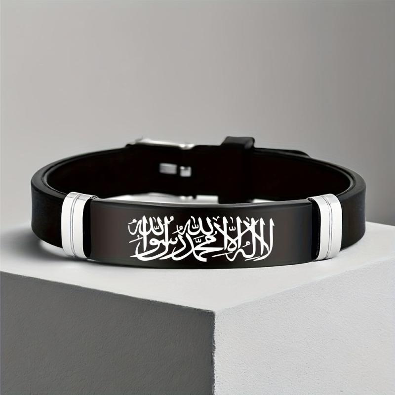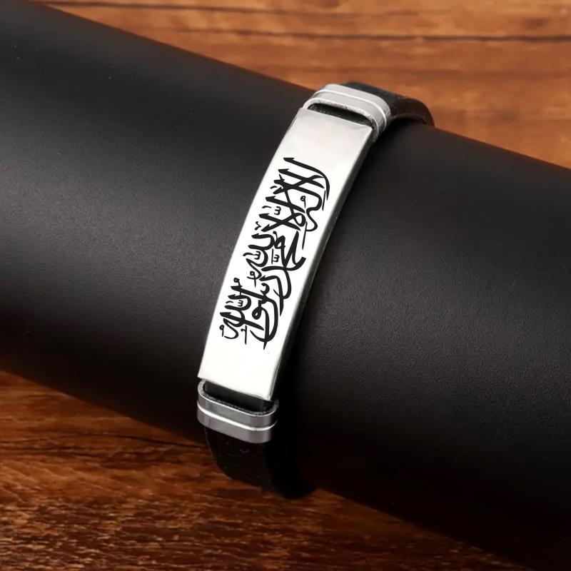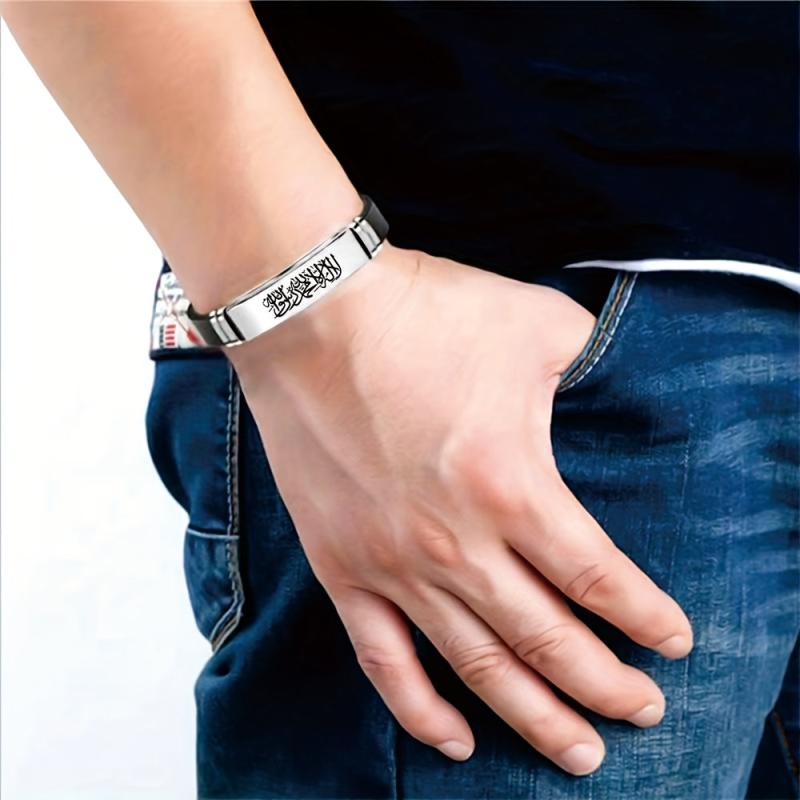 This stainless steel bracelet features beautiful Islamic Arabic calligraphy with engraved prayers for blessings from Allah. It is a meaningful and stylish accessory for anyone who appreciates Islamic art and culture.