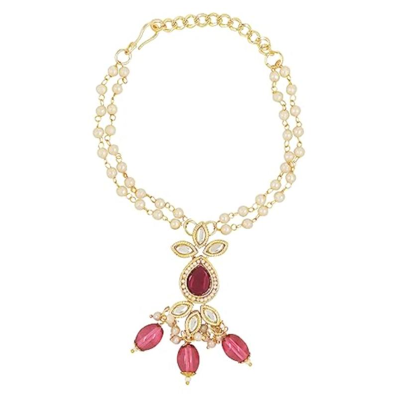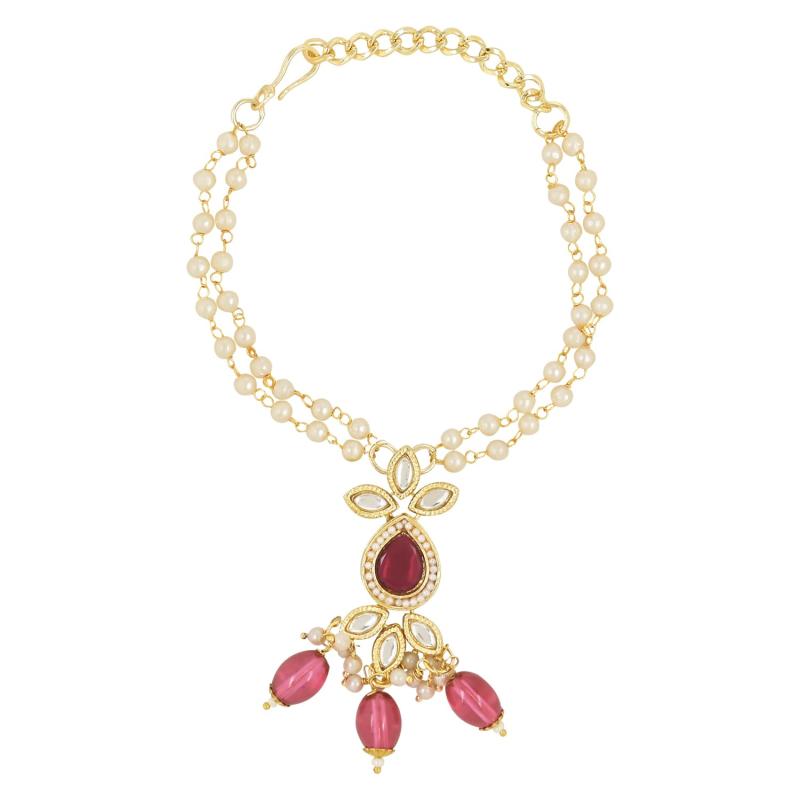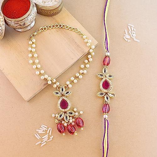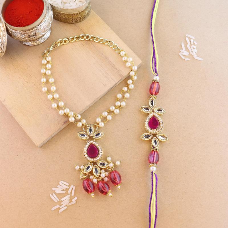 Elegant rakhi combo set with kundan and pearl hanging design. Includes Roli Chawal and Rakshabandhan card.
