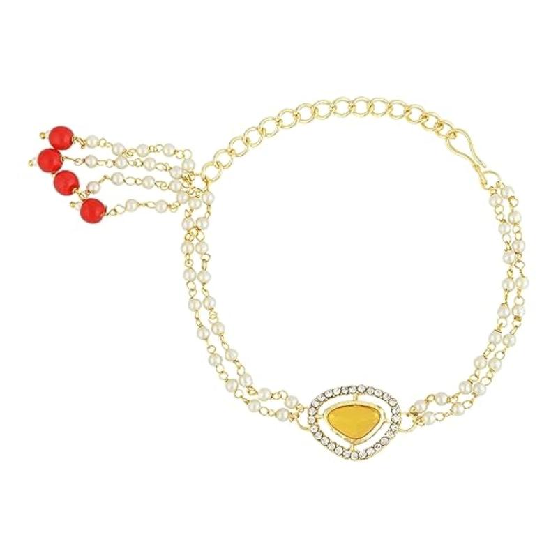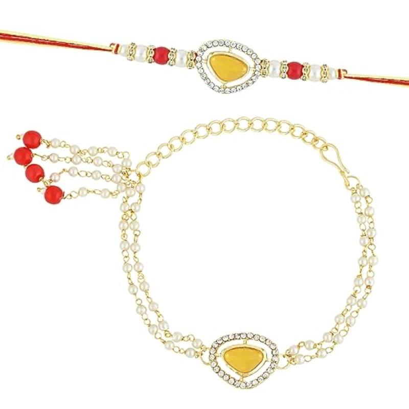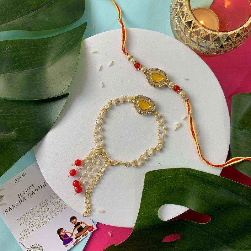 Celebrate the bond of love on Raksha Bandhan with this stunning Kundan & Pearl Bhaiya Bhabhi Lumba Rakhi Set. Perfect for gifting to your brother and sister-in-law.
