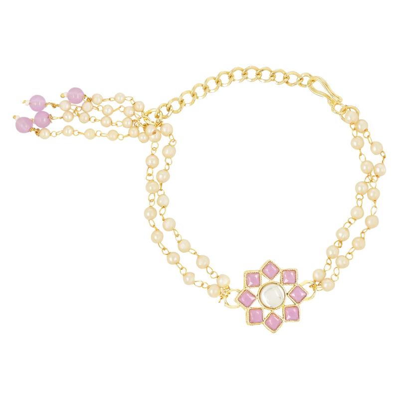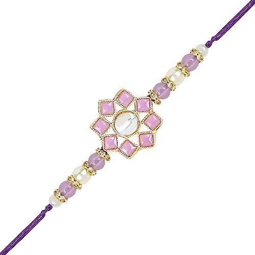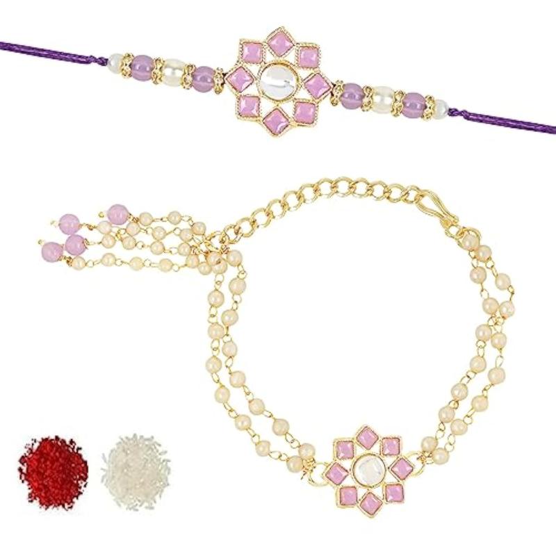 Beautiful combo set of Bhaiya Bhabhi Lumba Rakhi adorned with kundan and pearls. Includes Roli Chawal and Rakshabandhan card for a complete celebration.