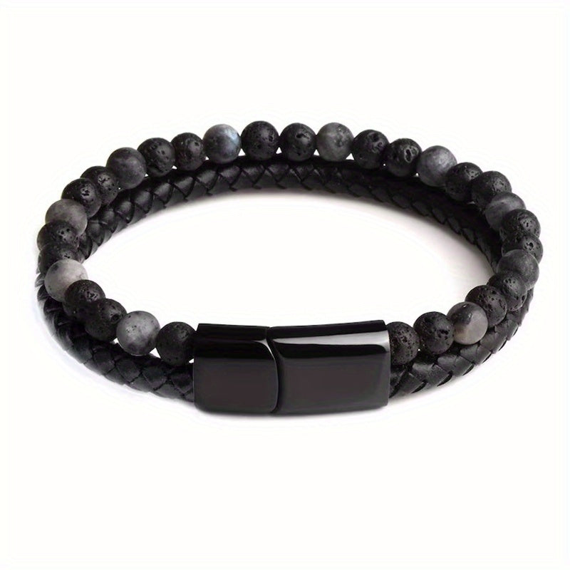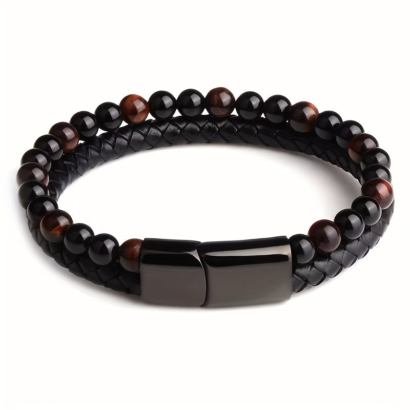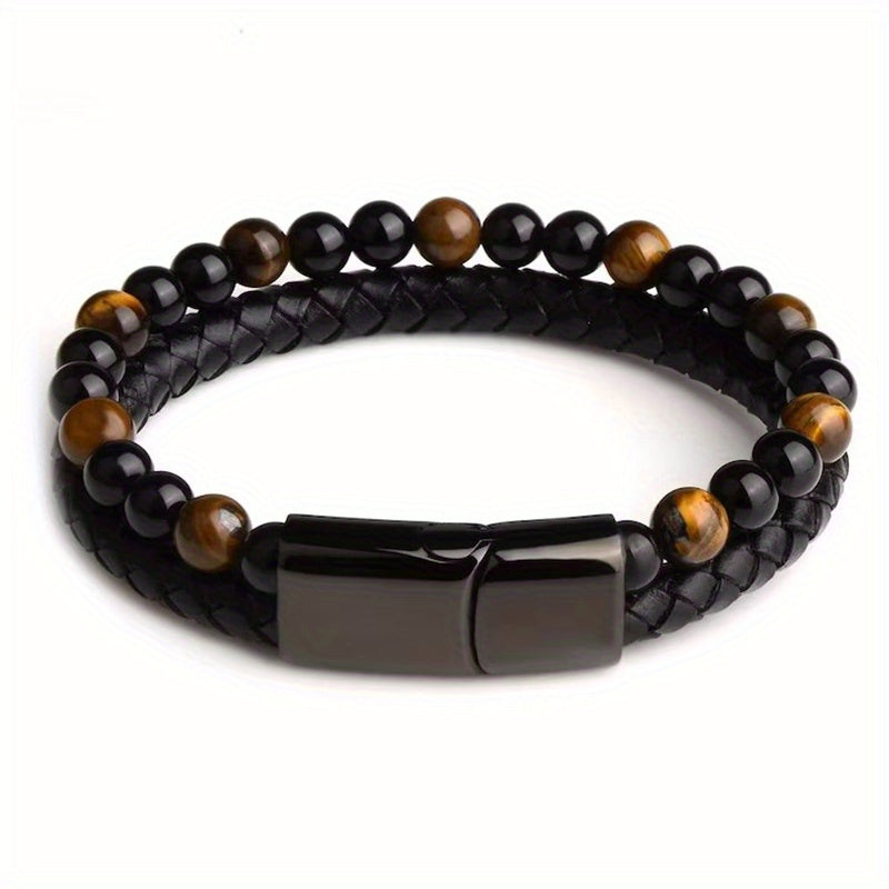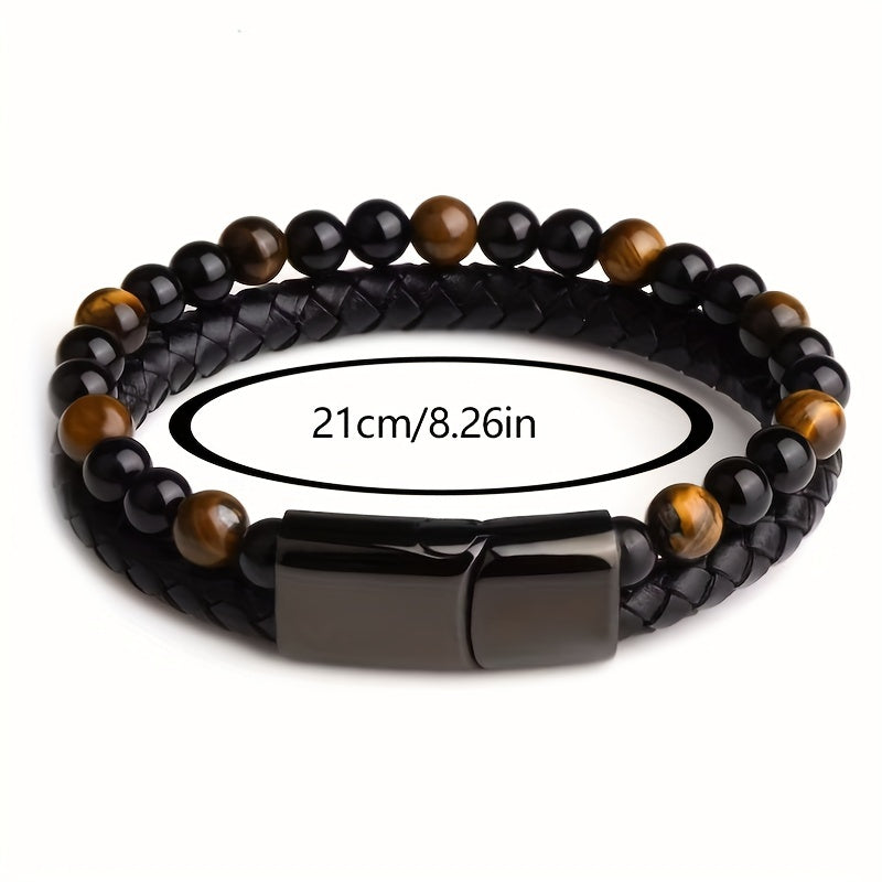 Elevate your style with this double layer leather braided bracelet featuring natural tiger eye stone beads. Perfect for daily wear or special occasions.