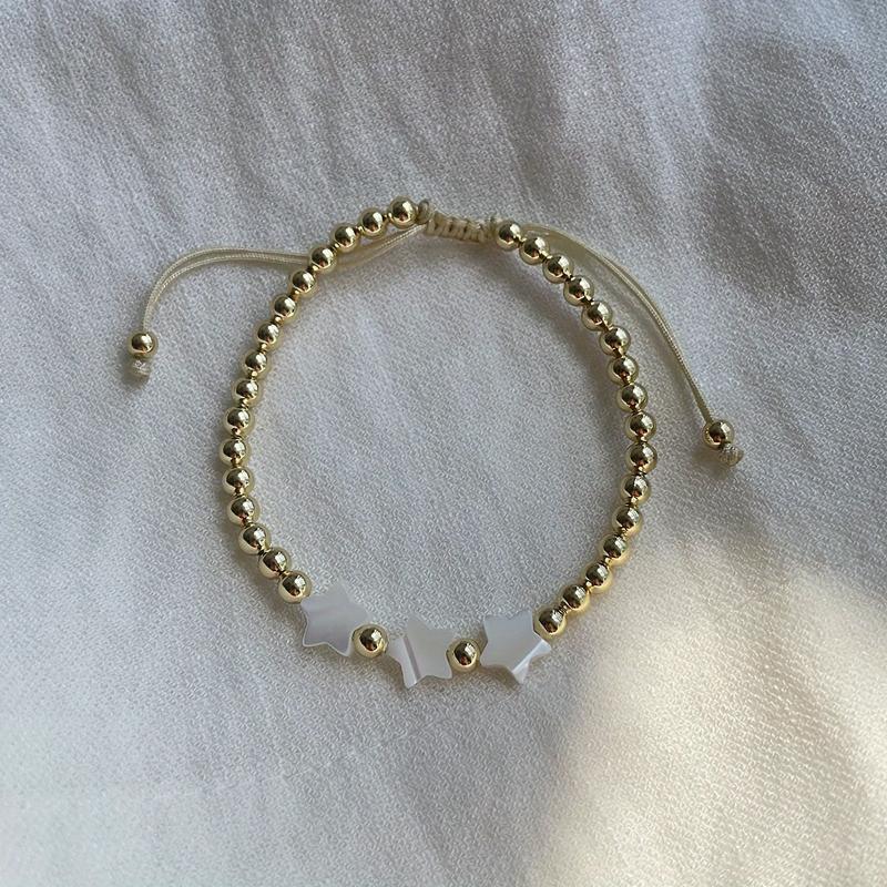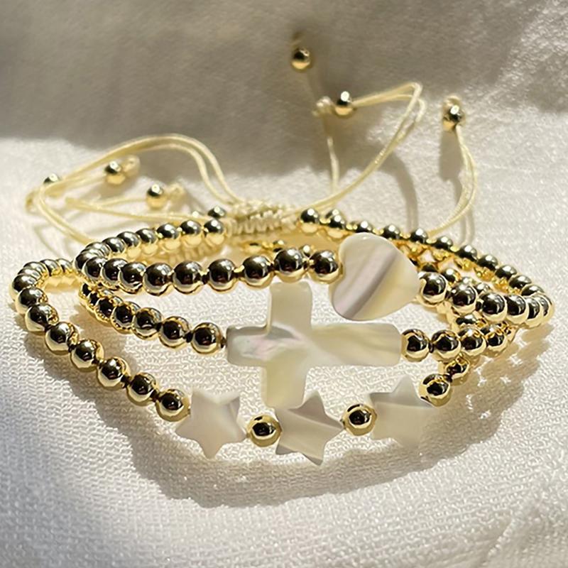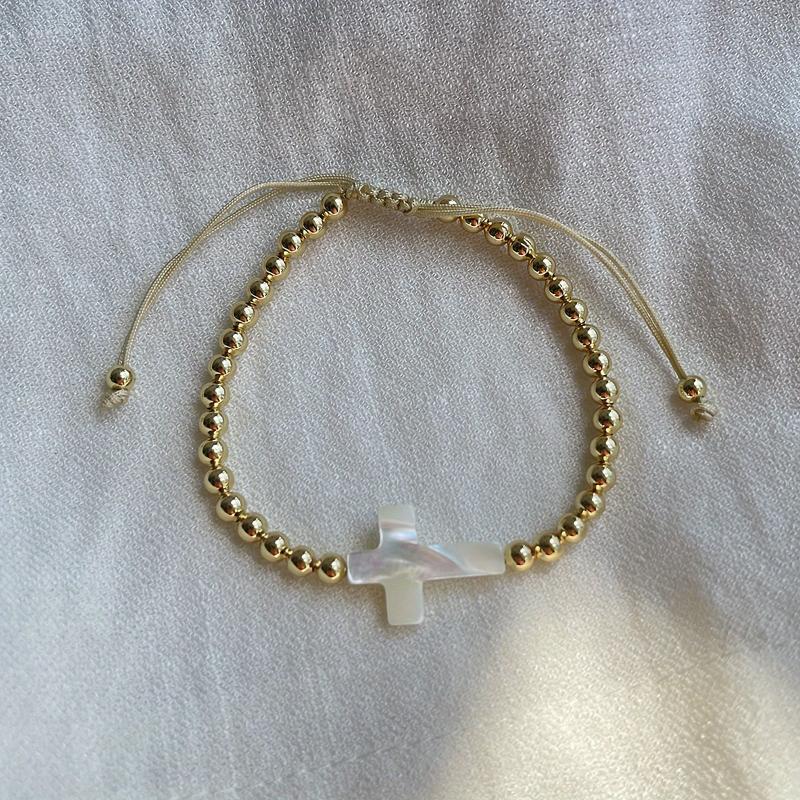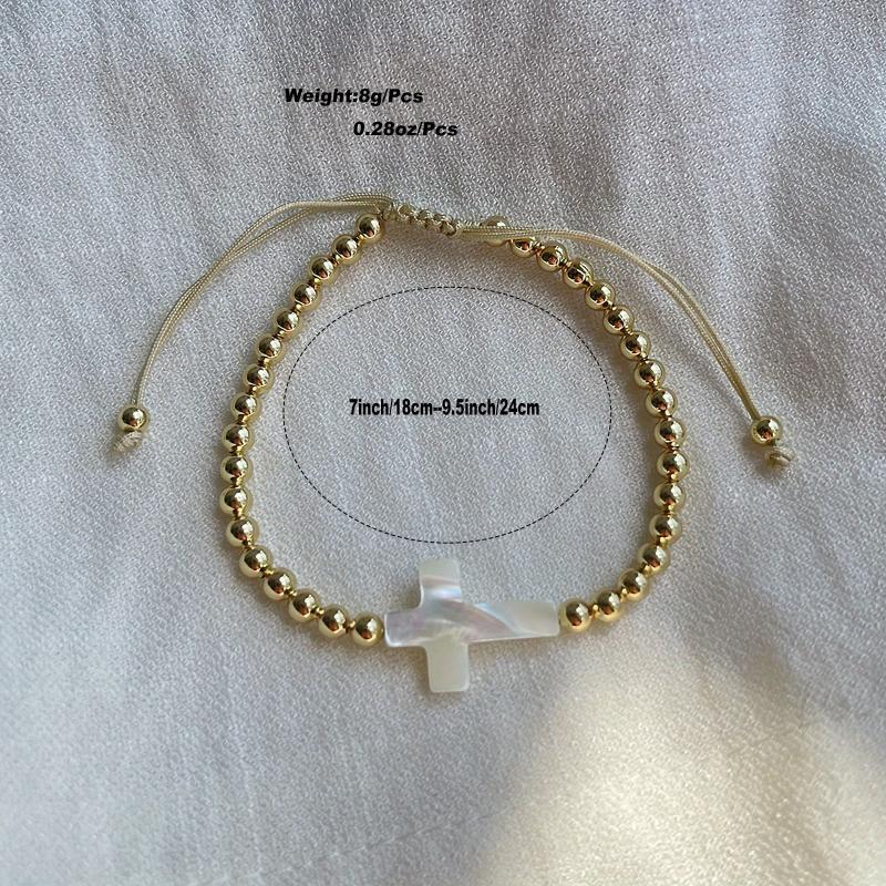 This stylish bracelet features stainless steel beads with a cross charm and a golden tone accent. Perfect for everyday wear or special occasions.