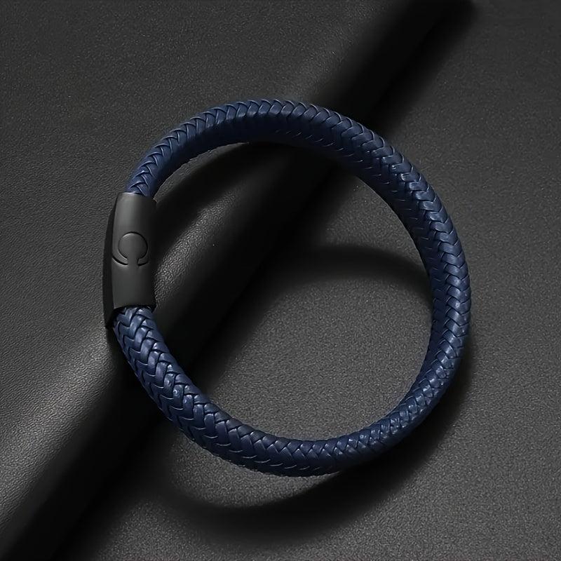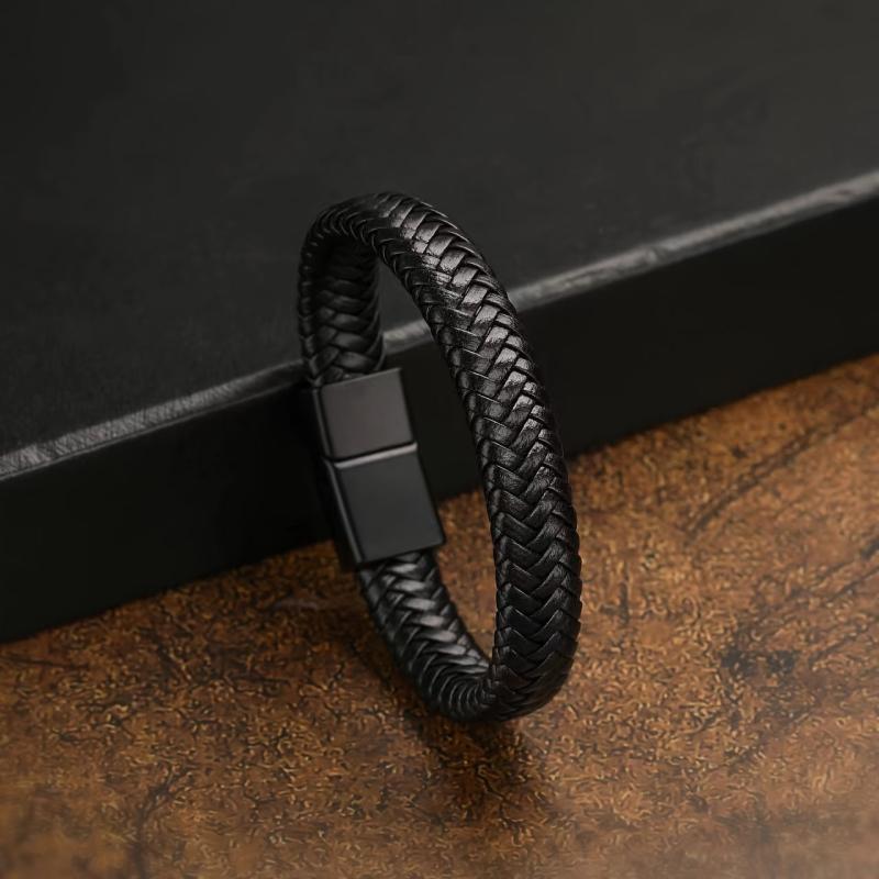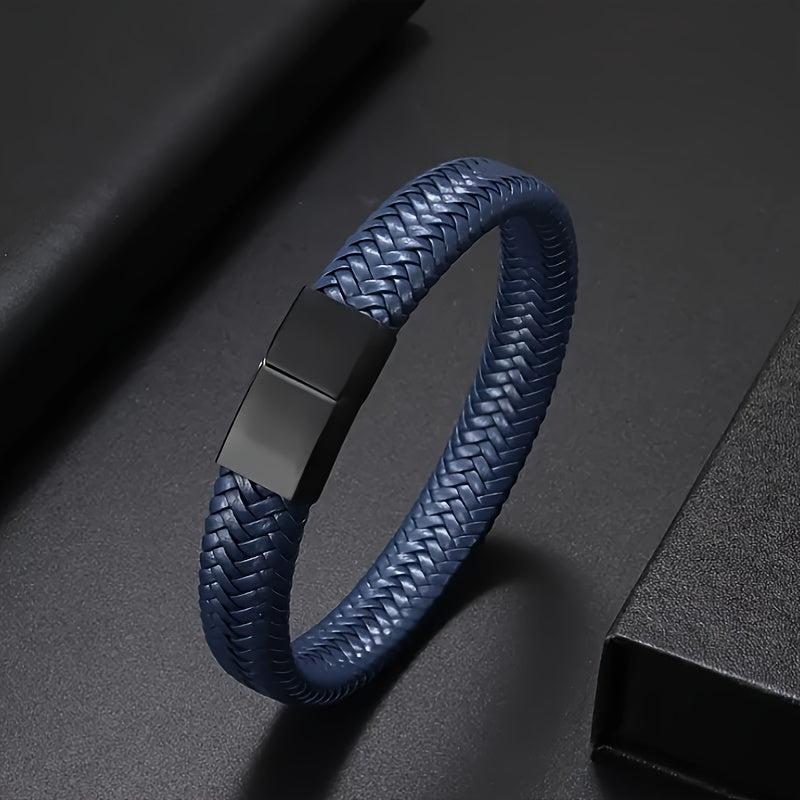 This vintage inspired bracelet features a stylish woven faux leather design with a polished metal clasp, perfect for both casual attire and special occasions.