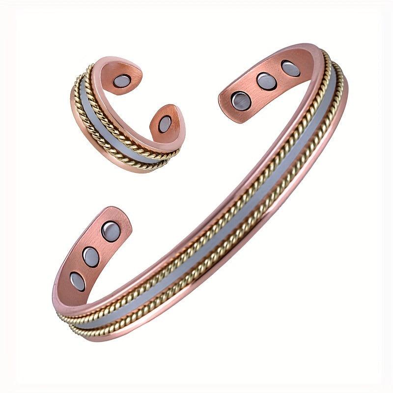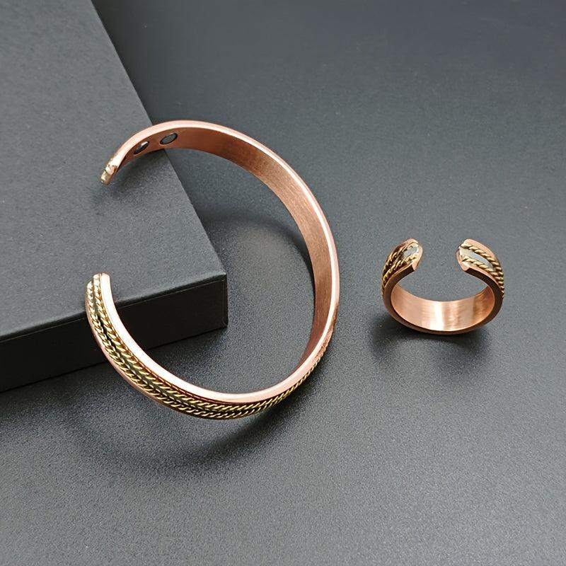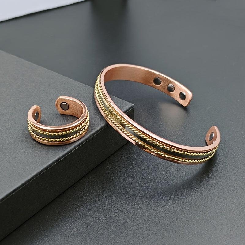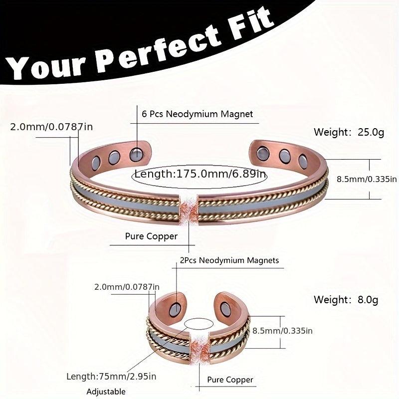 Enhance your style with this set of magnetic copper bracelet and ring. The adjustable cuff offers a comfortable wear and perfect accessories for any outfit.