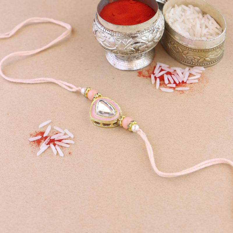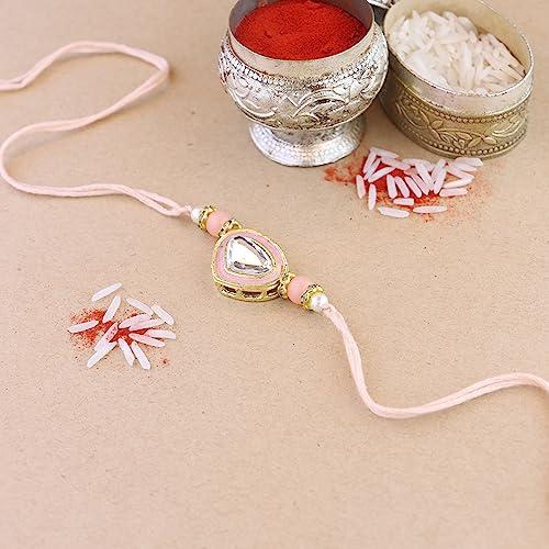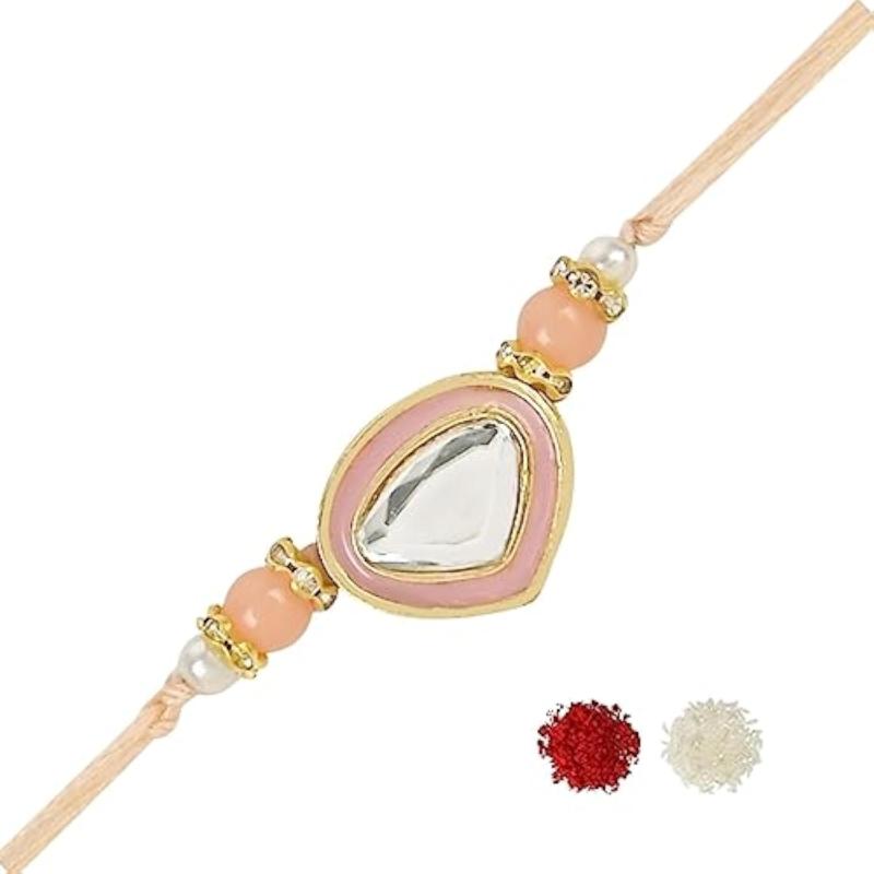 Beautiful Rakhi for Brother with traditional Meenakari Kundan and Pearl design. Includes Roli, Chawal, and Rakshabandhan card