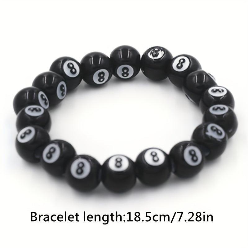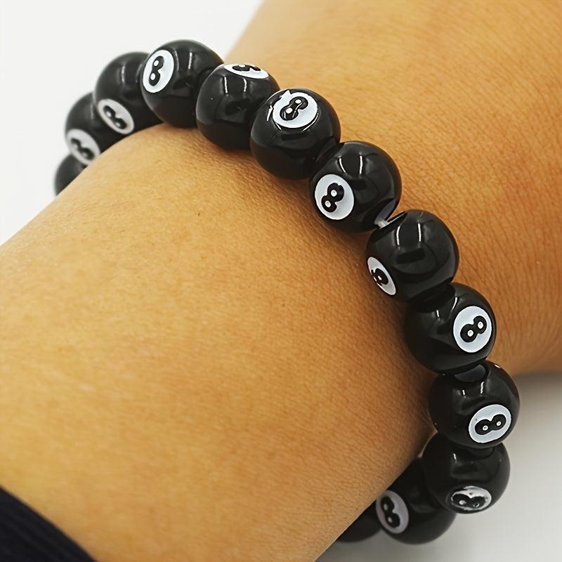 This men's casual bracelet features acrylic ball beads and a No 8 billiard charm. It is non-magnetic and has no plating for a natural look.