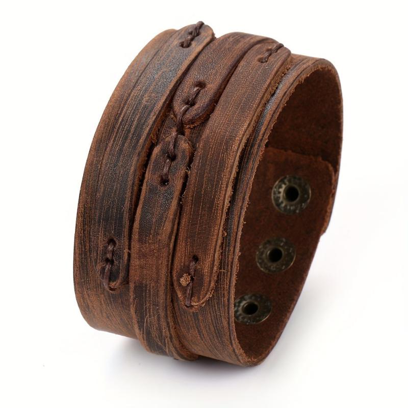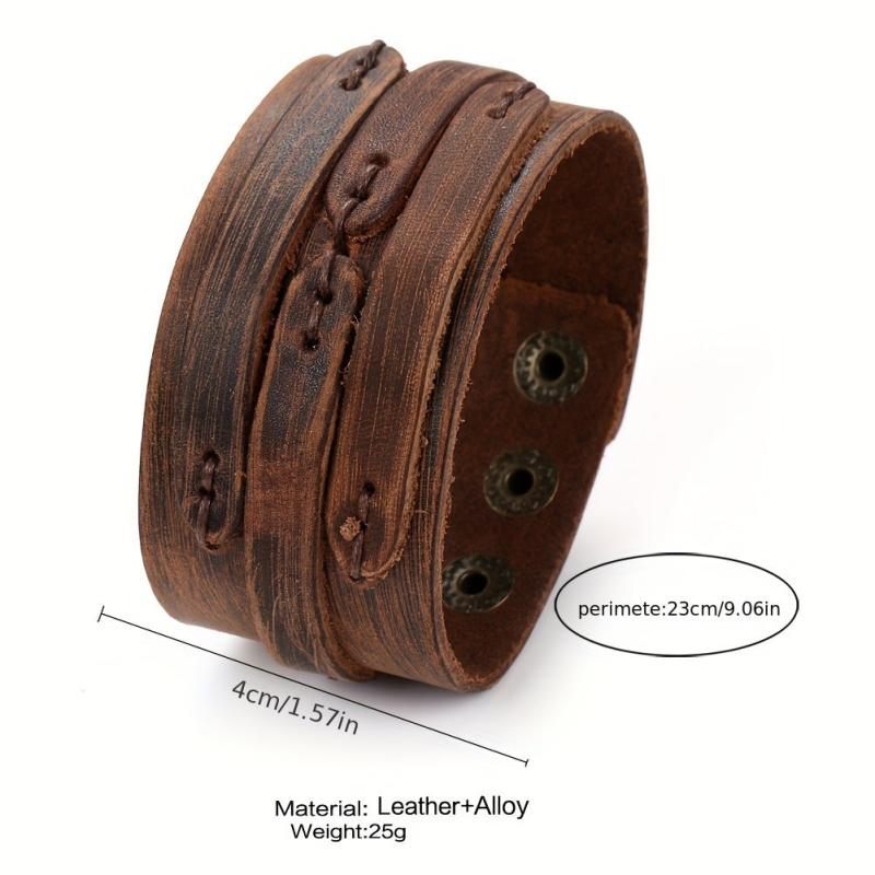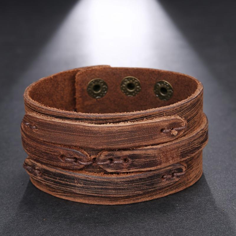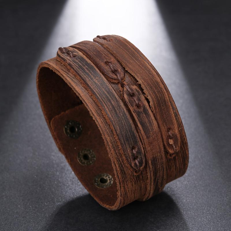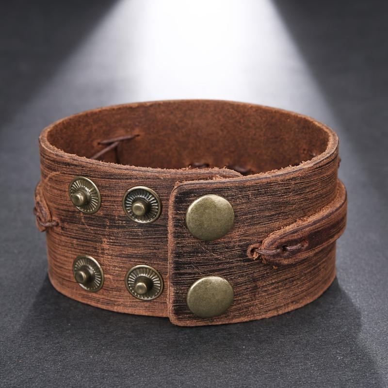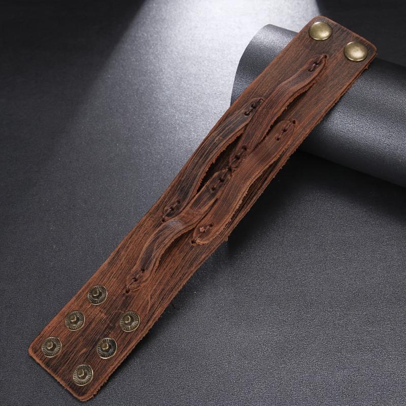 This braided leather bracelet features a vintage design with metallic eyelets. It is a durable accessory suitable for casual and formal wear.