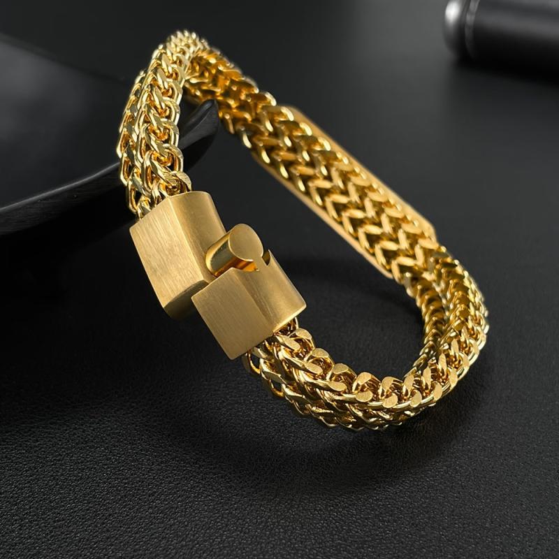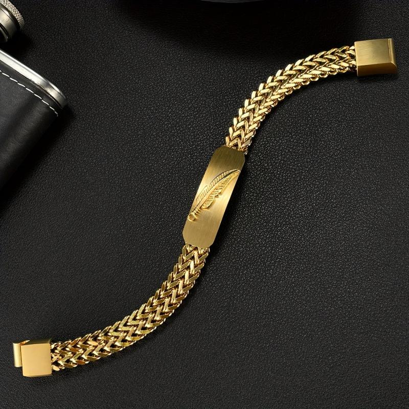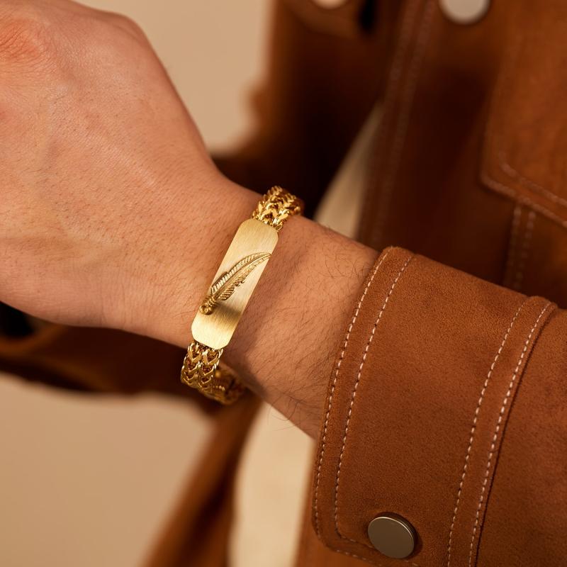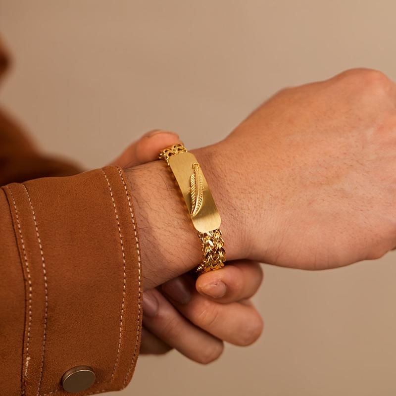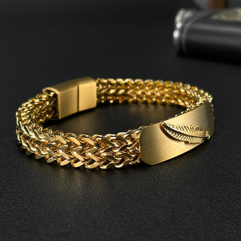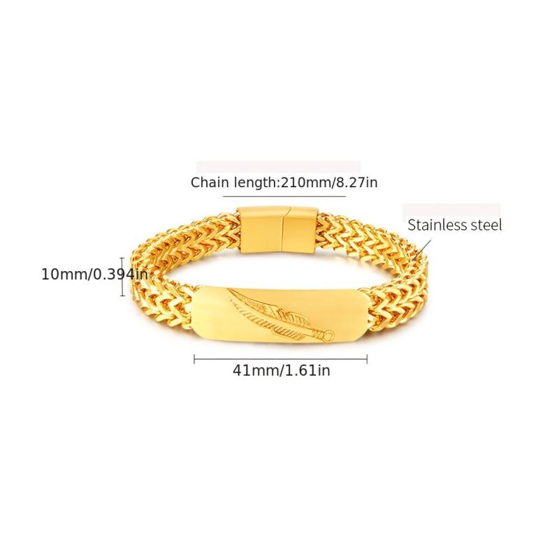 Add a touch of edgy style to your look with this golden tone bracelet featuring a feather design. Perfect for couples' dates or casual attire, this hip hop punk style accessory will elevate your date night outfit.