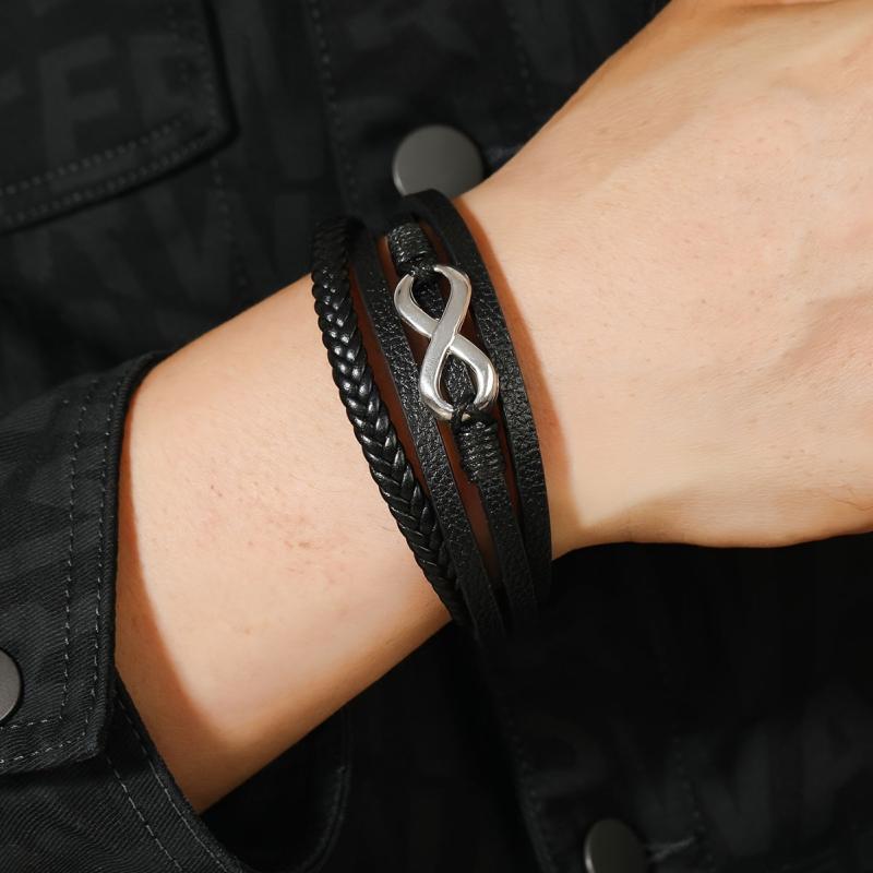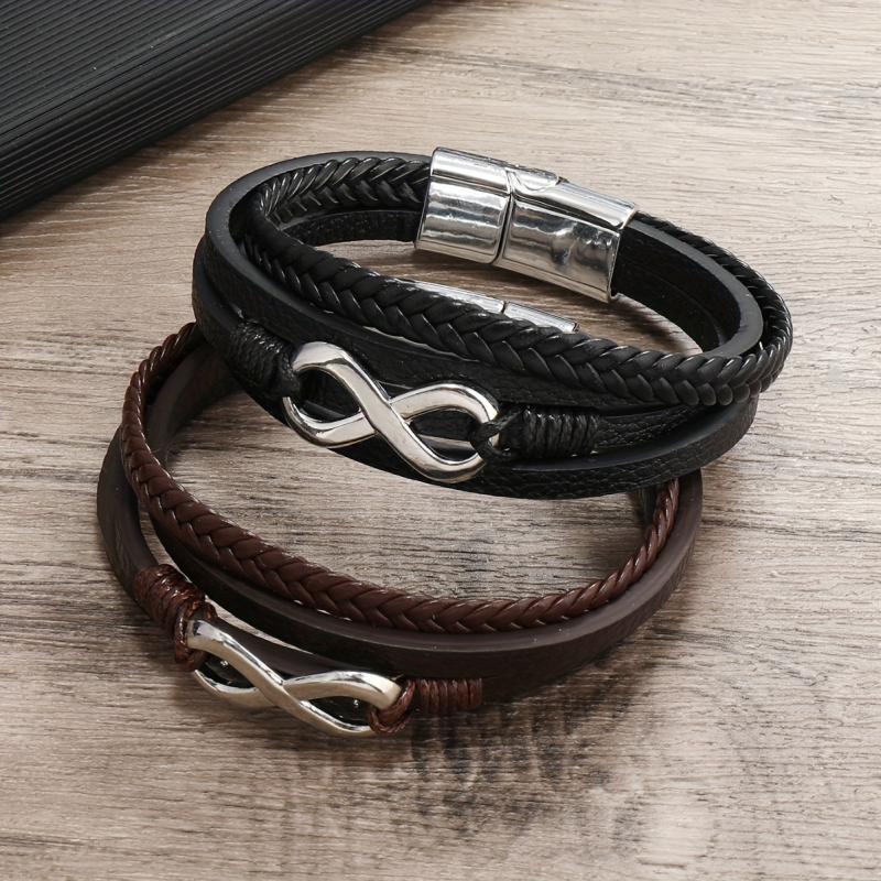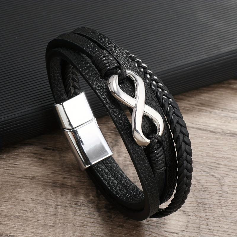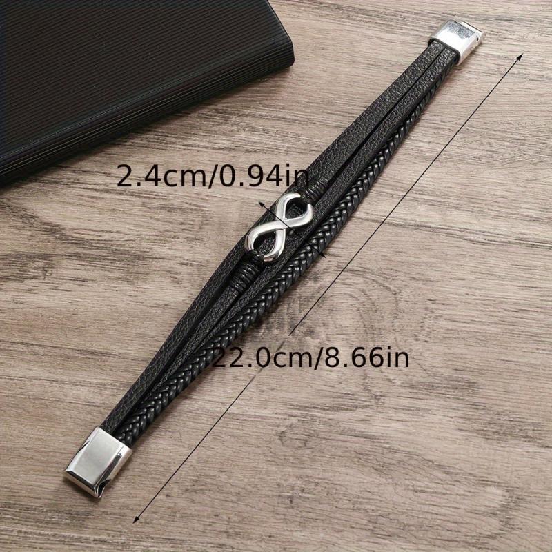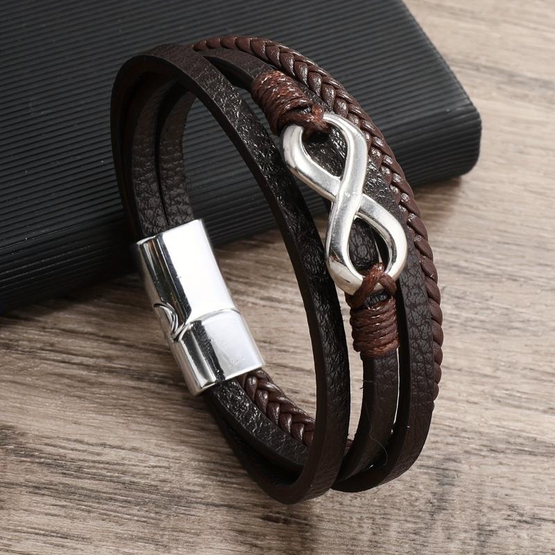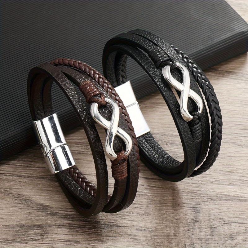 This men's fashionable hand woven bracelet features a faux leather design with a magnetic clasp. It is an endless loop style with no pendant, making it a stylish accessory for any outfit.