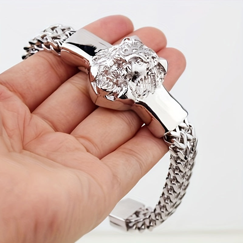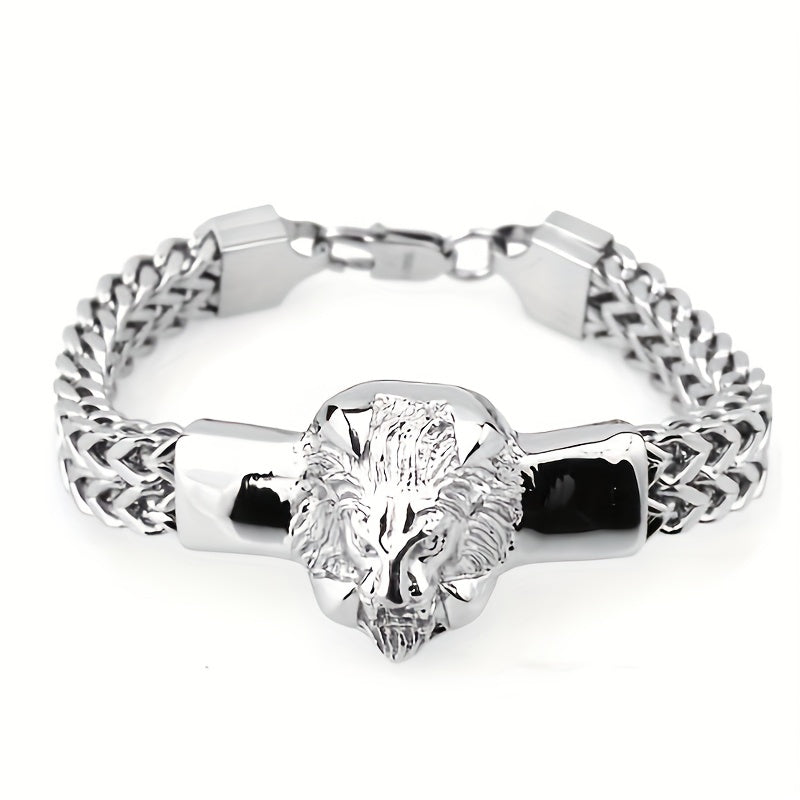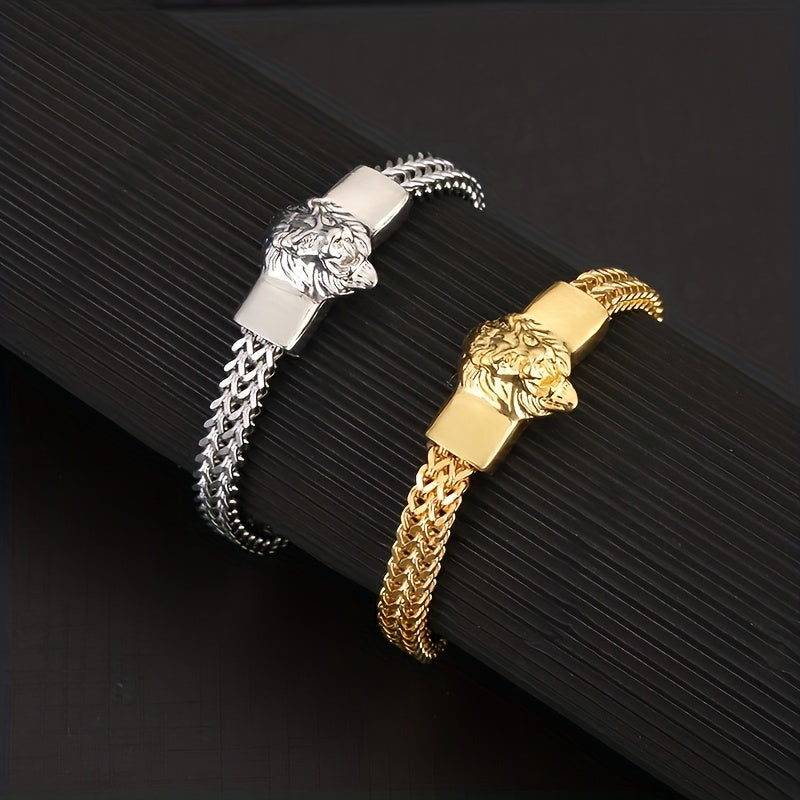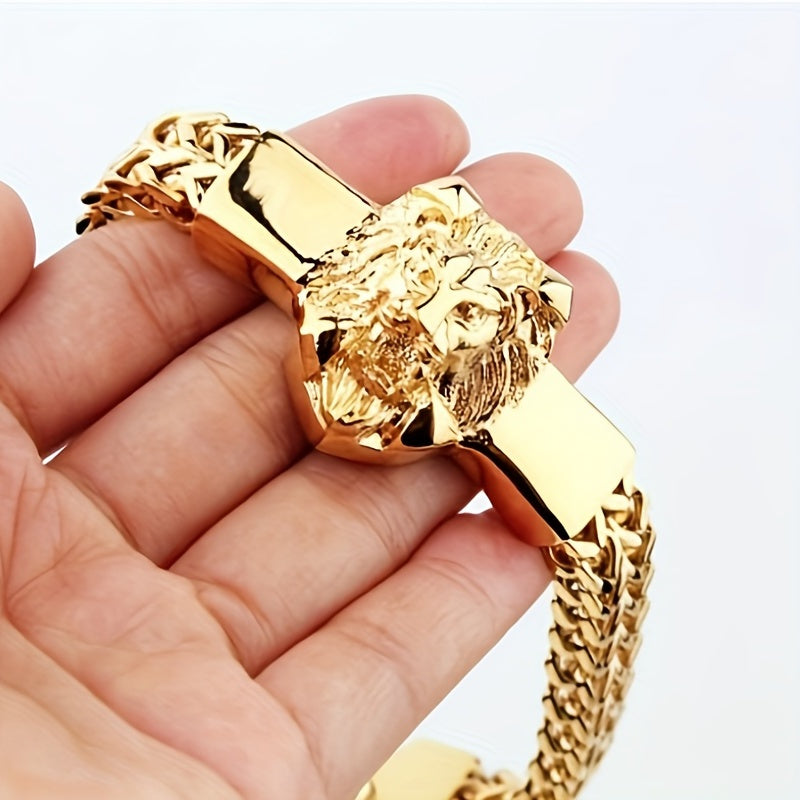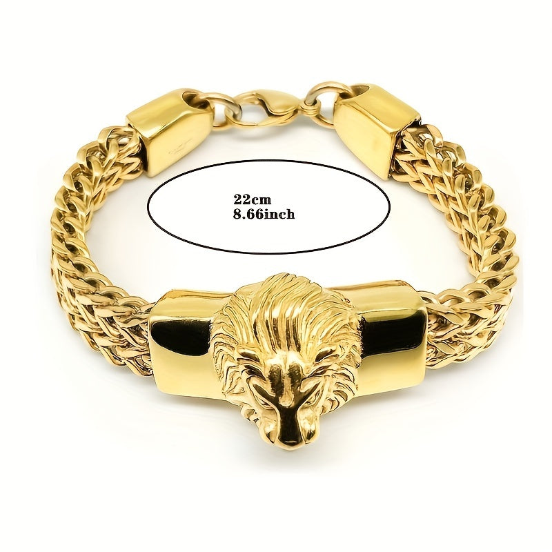 Add a fierce touch to your style with this lion stainless steel bracelet. The golden plated link chain design is perfect for punk rock or biker looks. It makes a great artificial jewelry gift for any occasion.