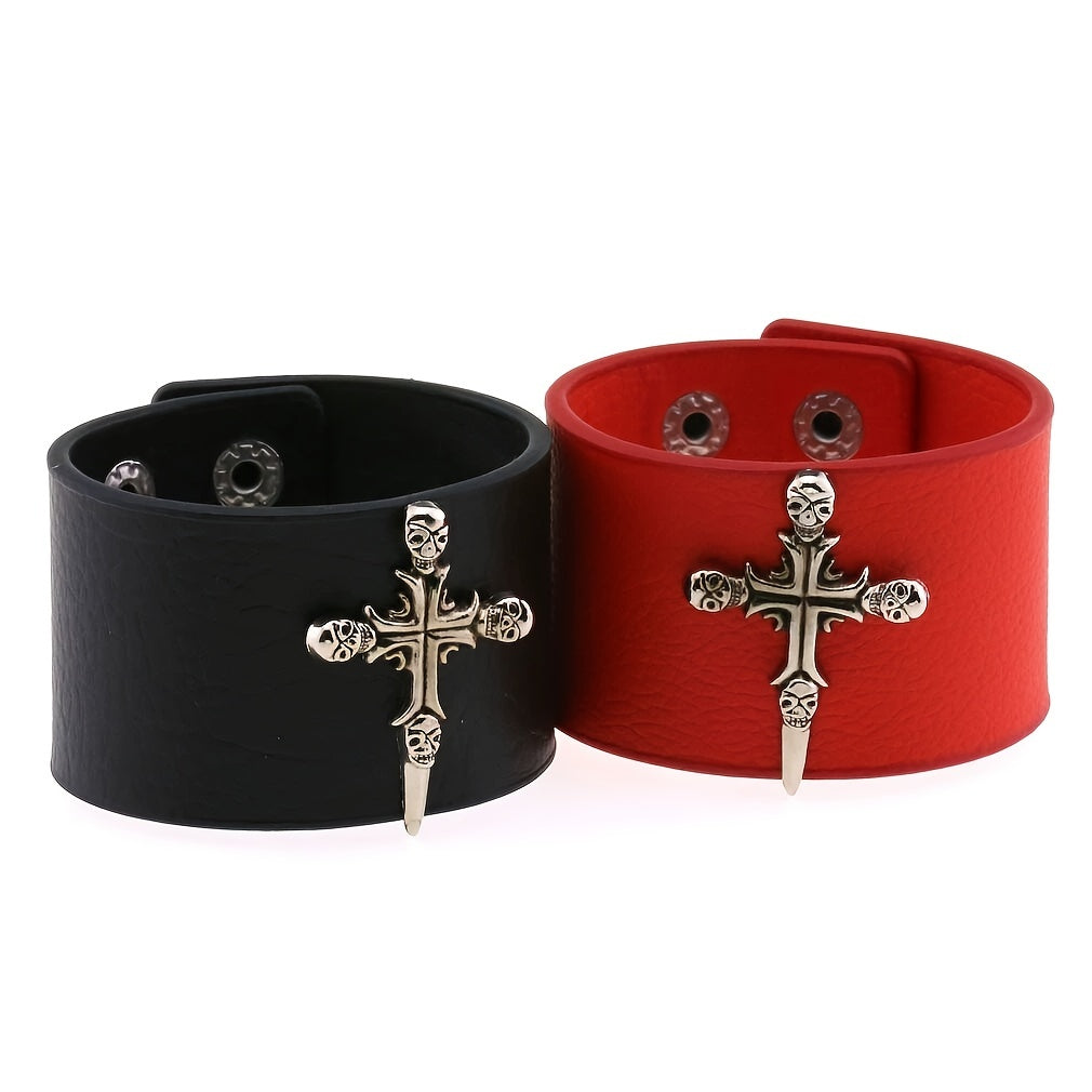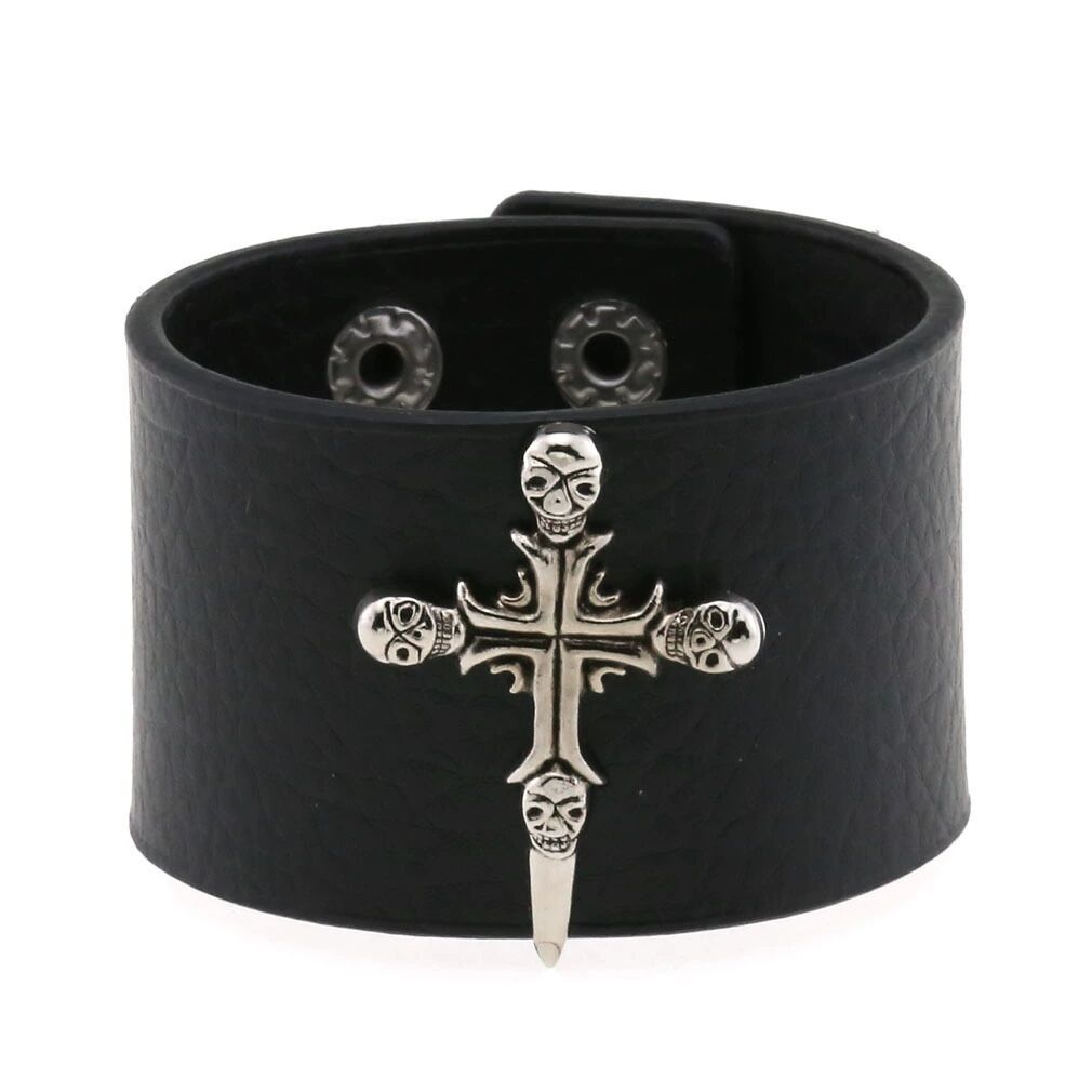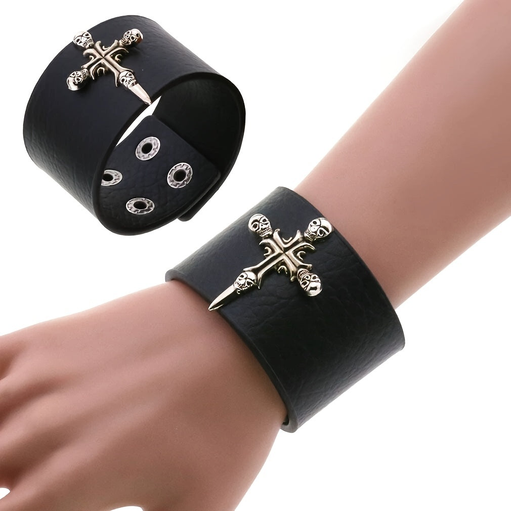 Add a touch of punk gothic style to your outfit with this wide PU leather bracelet featuring a skull head design. Perfect for men who like bold accessories.